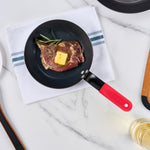 Enhance your culinary efficiency with our Met Lux 6 Black Carbon Steel 8" Pre-Seasoned Fry Pans with 6 Red Silicone Pan Handle Sleeves. Crafted from 1.5 mm thick carbon steel, these fry pans ensure exceptional durability and longevity, standing up to the demands of everyday use. Lightweight yet robust, these fry pans are easy to handle and maneuver, ensuring a seamless cooking experience. Designed for versatility, these fry pans are suitable for all stovetops, allowing you to sear, sauté, and fry with ease. Featuring a non-coated surface, these fry pans provide efficient heat distribution for even cooking every time. These oven-safe fry pans broaden your culinary possibilities, making them ideal for various cooking methods. The triple-riveted handle of these pre-seasoned fry pans offers a secure grip and added strength, while the hanging hole ensures easy storage. Efficiently induction-safe, these pans are perfect for any cooking surface and method. The included red silicone handle sleeves with these fry pans are heat resistant up to 450F, ensuring a comfortable and secure grip on hot pans. Plus the molded indentations on these sleeves provide an ergonomic grip, enhancing safety and convenience. The removable design of the sleeves allows for quick switching between pans, saving time and effort. Conveniently dishwasher-safe, these handle sleeves are easy to clean and maintain. Each pan measures 14.17 inches in diameter by 3.5 inches in height with the handle, and the sleeves measure 4.72 inches in length by 2.75 inches in width, fitting all sizes of fry pans. Each order includes 6 pans and 6 sleeves.