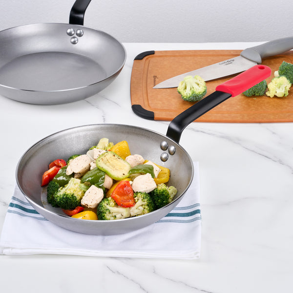 Revolutionize your kitchen operations with our Met Lux 6 Carbon Steel 10" Non-Stick Fry Pans with 6 Red Silicone Pan Handle Sleeves. These fry pans, constructed from 3 mm thick carbon steel, ensure superior durability and optimal heat distribution for uniform cooking. The lightweight design of these fry pans simplifies the cooking process, making them a must-have in any high-traffic kitchen. After seasoning, these hand-washable skillet pans develop non-stick properties, greatly enhancing your culinary experience. With these carbon steel pans oven-safe capability, you can transition dishes seamlessly from the stovetop to the oven. The triple-riveted handle of these fry pans ensures a secure grip, providing confidence during cooking and pan transfer. These induction-safe fry pans are compatible with all types of stovetops, offering a versatile frying solution. The hanging hole on the handle of these fry pans allows for convenient storage, saving precious kitchen space. These black silicone removable pan handle sleeves are heat-resistant up to 450F, protecting your hands from burns. The molded indentations on these handle sleeves ensure a firm grip even in high-heat situations, and their removable design allows for flexible use on multiple pans. For added convenience, these handle sleeves feature a hanging loop for easy storage and are dishwashable for effortless maintenance. Measuring 18.31 inches in length by 10.24 inches in width by 4.06 inches in height, these 10-inch pans offer ample space for various dishes. Each order includes 6 pans and 6 sleeves.