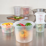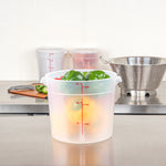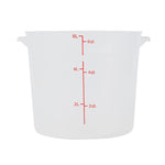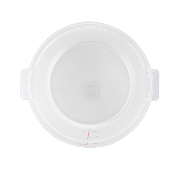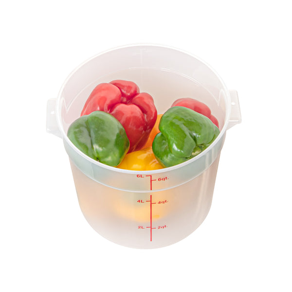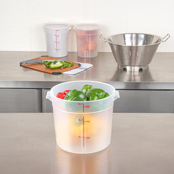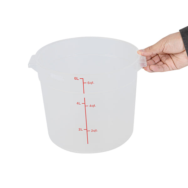 Upgrade your food storage solution with our Met Lux 6-quart Round Translucent Plastic Food Storage Container. This food storage container is crafted from durable PP plastic, ensuring long-lasting use in any busy kitchen or catering setting. Featuring a red volume marker, this plastic food storage container allows for quick and accurate measuring of your ingredients. With a stable handle, this food container enables easy transport and handling, ensuring no spill or mess. Designed to be dishwashable and freezable, this round plastic food container is a versatile addition to your storage and cleaning solutions. Capable of withstanding temperatures ranging from -40 to 160 degrees Fahrenheit, this translucent food container is perfect for preserving both hot and cold dishes. Pair this round plastic container with a matching lid (SKU: RWT1575C-1) to maintain the freshness and quality of your food. Boasting a generous 6-quart capacity, this storage container measures 8.75 inches in diameter by 7.75 inches in height, making it ideal for storing various types of food items. Sold in a 1 count box. Lid is available and sold separately.