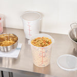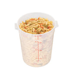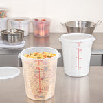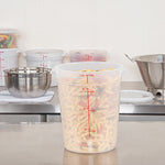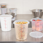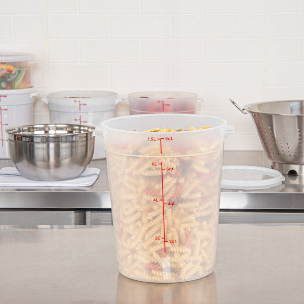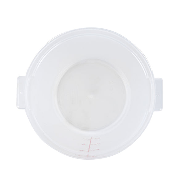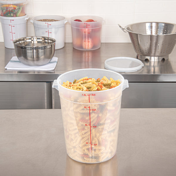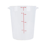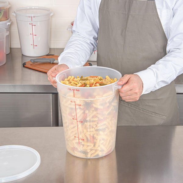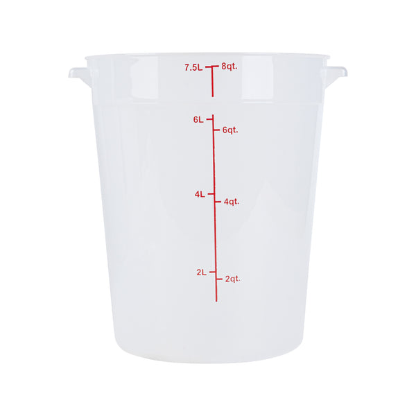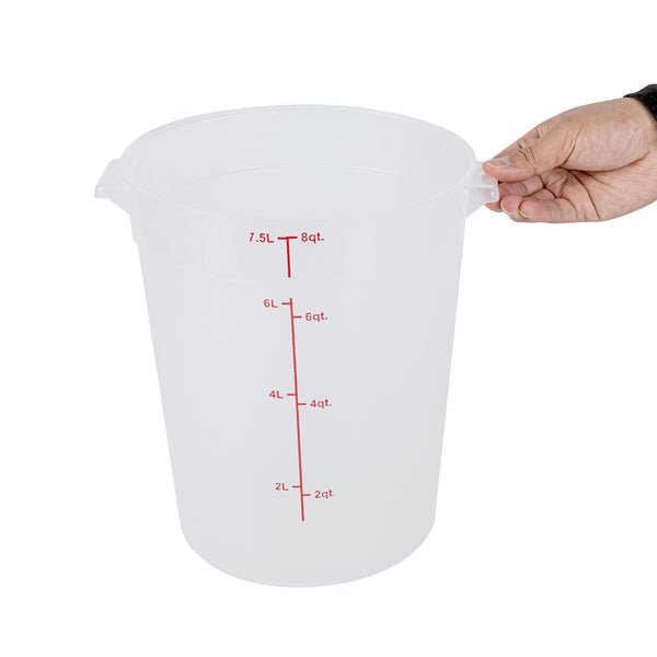 Store food in your kitchen with our Met Lux 8-quart Round Translucent Plastic Food Storage Containers. Crafted from durable PP plastic, these food storage containers are designed to withstand a wide temperature range from -40 to 160 degrees Fahrenheit, perfect for preserving a variety of food items. The round plastic food containers feature red volume markers or graduations, making it easy to measure ingredients or control portions in your restaurant or bakery. With stable handles attached, these food containers ensure a secure grip for easy transport. These translucent food containers allow for quick and convenient identification of contents, avoiding the need for unnecessary opening and checking. Designed to accommodate a volume of 8-quart, these round plastic containers are ideal for storing large quantities of food items. Conveniently pair these containers with their corresponding lids (SKU: RWT1575C) to ensure maximum freshness and avert spills. Measuring 8.75 inches in diameter by 10.75 inches in height, these storage containers offer ample space without taking up too much room in your kitchen or storeroom. Sold in a 10 count box. Lids are available and sold separately.