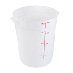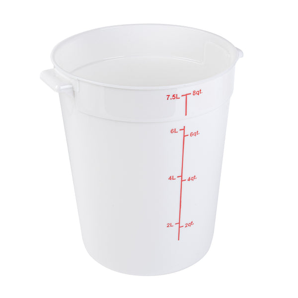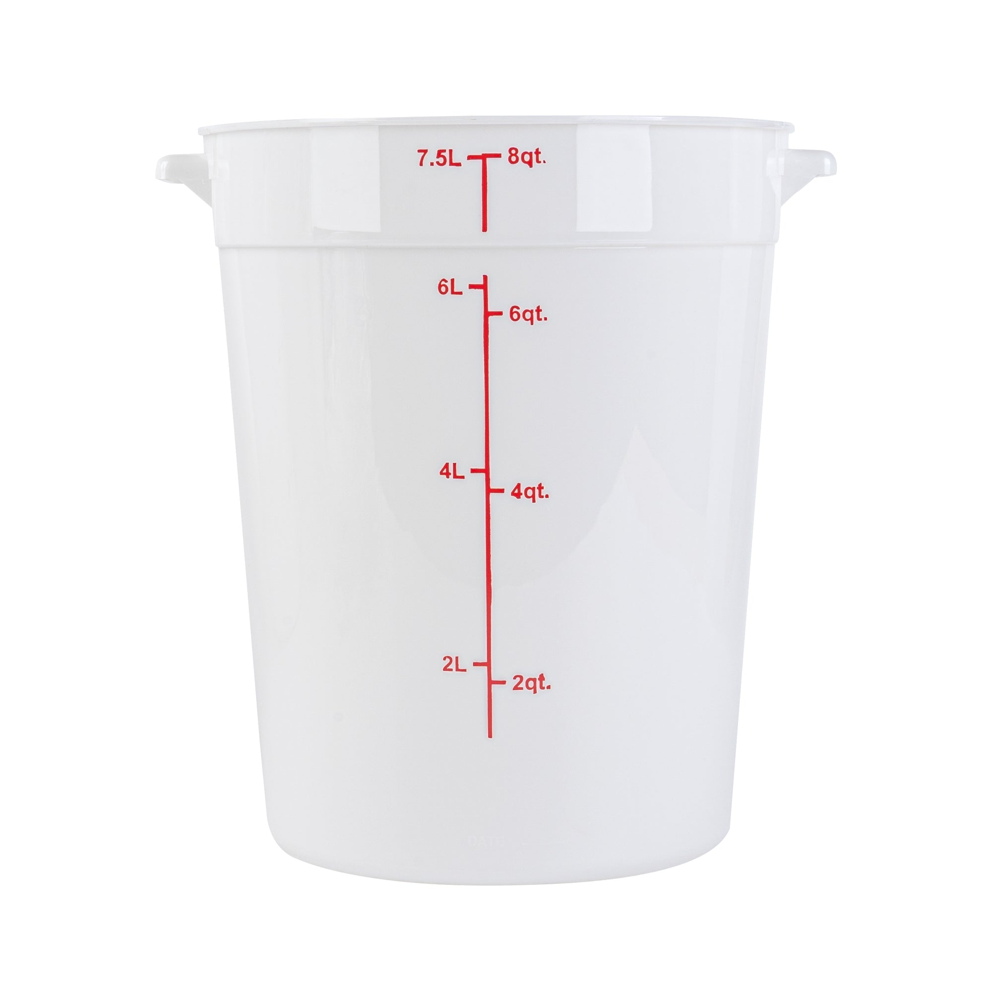 Streamline your kitchen organization with our Met Lux 8-quart Round White Plastic Food Storage Containers. Crafted from durable PP plastic, these food storage containers are built to withstand wear and tear, ensuring long-lasting use in your commercial kitchen. Featuring red volume markers, these plastic food storage containers allow for easy measurement and portion control, helping to reduce food waste. The stable handles of these round plastic food containers make transport effortless, enhancing efficiency in your establishment. Designed to withstand temperatures ranging from -40 to 160 degrees Fahrenheit, these food containers are both freezable and dishwashable, providing the versatility your kitchen requires. With a white finish, these round plastic containers allow for quick identification of contents, saving you time during busy service hours. Boasting a generous capacity of 8 quarts, these storage containers are ideal for storing large batches of ingredients or prepared food. Pair these containers with our lids (SKU: RWT1575C) to seal in freshness. Measuring 8.75 inches in diameter by 10.75 inches in height, these food containers are compact and easy to store, providing valuable kitchen space. Sold in a 10 count box. Lids are available and sold separately.