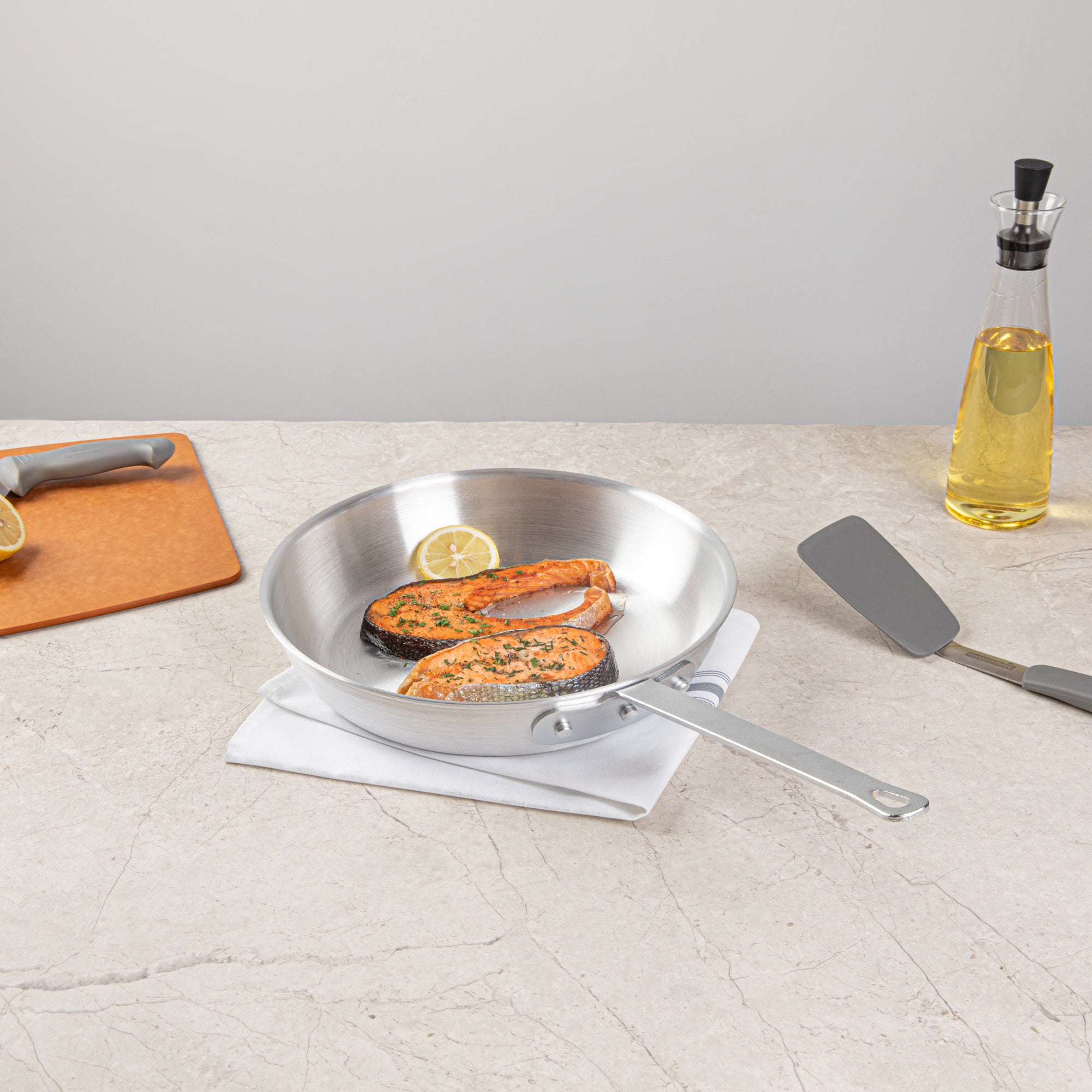 Cook delicious dishes easily using our Met Lux Aluminum 12-inch Fry Pans. These frying pans feature a 3.5 mm thick aluminum construction, ensuring durability and efficient heat distribution for perfectly cooked meals. Impressively lightweight, these aluminum fry pans are easy to maneuver when flipping or stirring your dishes. The satin finish on these silver fry pans not only adds a sleek touch to your kitchen equipment but also makes food release smoother. Sporting a triple-riveted handle, these skillet pans offer a comfortable, secure grip for secure handling. Plus, the handle has a hanging hole, making these aluminum skillets easy to store and saving valuable kitchen space. For optimal care and maintenance, hand washing is recommended for these aluminum skillets. These 12-inch aluminum frying pans measure 22.25 inches in diameter and 4 inches in height, including the handle, providing ample space for cooking various dishes. Sold in a 6 count box.