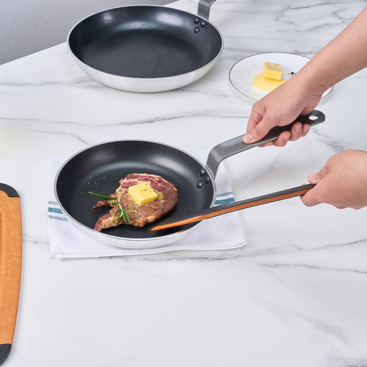 The triple-riveted handle of these aluminum fry pans ensures a secure grip for comfortable cooking. Enjoy enhanced control while maneuvering your pans on the stove.