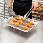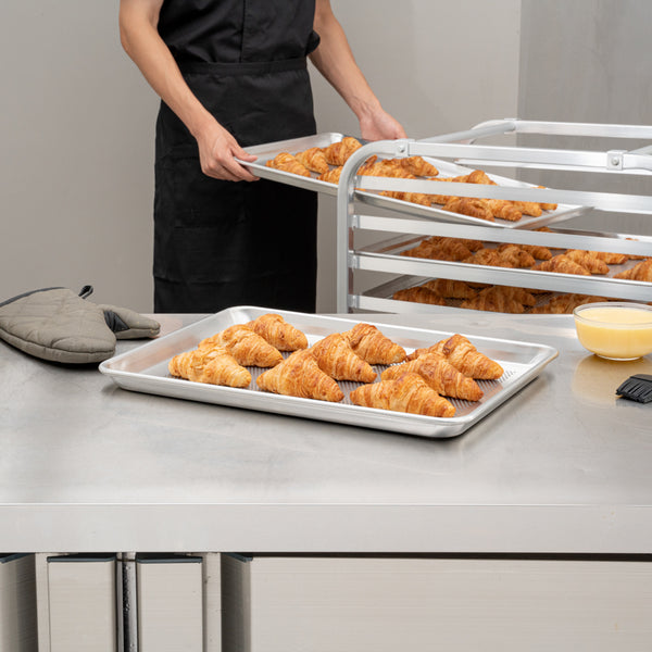 Kick up your baking supplies with our Met Lux Aluminum Half Size Baking Sheet. This half-size baking sheet is constructed with silver aluminum, making it sturdy to hold sufficient amounts of food in place. For extra stability when handling ingredients in and out of the oven, this freezer-safe aluminum baking sheet is designed with a 19-gauge wire-reinforced rim. Perfect for evenly baking chewy cookies or crispy french fries, this rimmed baking sheet is built with a perforated style for easy airflow to cut down your baking time. To avoid a cluttered kitchen, this baking sheet is stackable. This cookie baking sheet is oven-safe, preventing your supplies from melting or losing their overall quality. To easily store various sheets in one place, this baking sheet is compatible with our Kitchen Tek bun/sheet pan racks. This cupcake baking sheet measures 18 inches in length by 13 inches in width by 1 inch in height. Sold in a 1 count box.