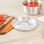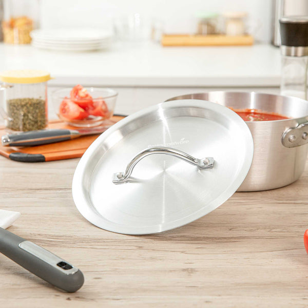 Seal in heat and enhance cooking efficiency with Met Lux Heat-Sealing Sauce Pan Lid. This aluminum sauce pan lid is expertly crafted to seal in heat, reduce spatter, and maintain moisture, ensuring your dishes are cooked to perfection. Its handle is easy to grab with a pad or towel, significantly reducing the risk of burns during use as an oven safe pan cover. Designed to withstand high temperatures, this cooking pot lid is oven-safe, making it a versatile addition to any professional kitchen. With dimensions of 8.74 inches by 8.74 inches, these lids fit securely on 2.75 quart sauce pans (sold separately), promoting efficient cooking while providing a clean, professional appearance. The warp-resistant aluminum construction ensures durability and longevity, supporting everyday use without compromising quality. Equip your kitchen with these essential tools to elevate your cooking experience. Sold in a 12 count box.
