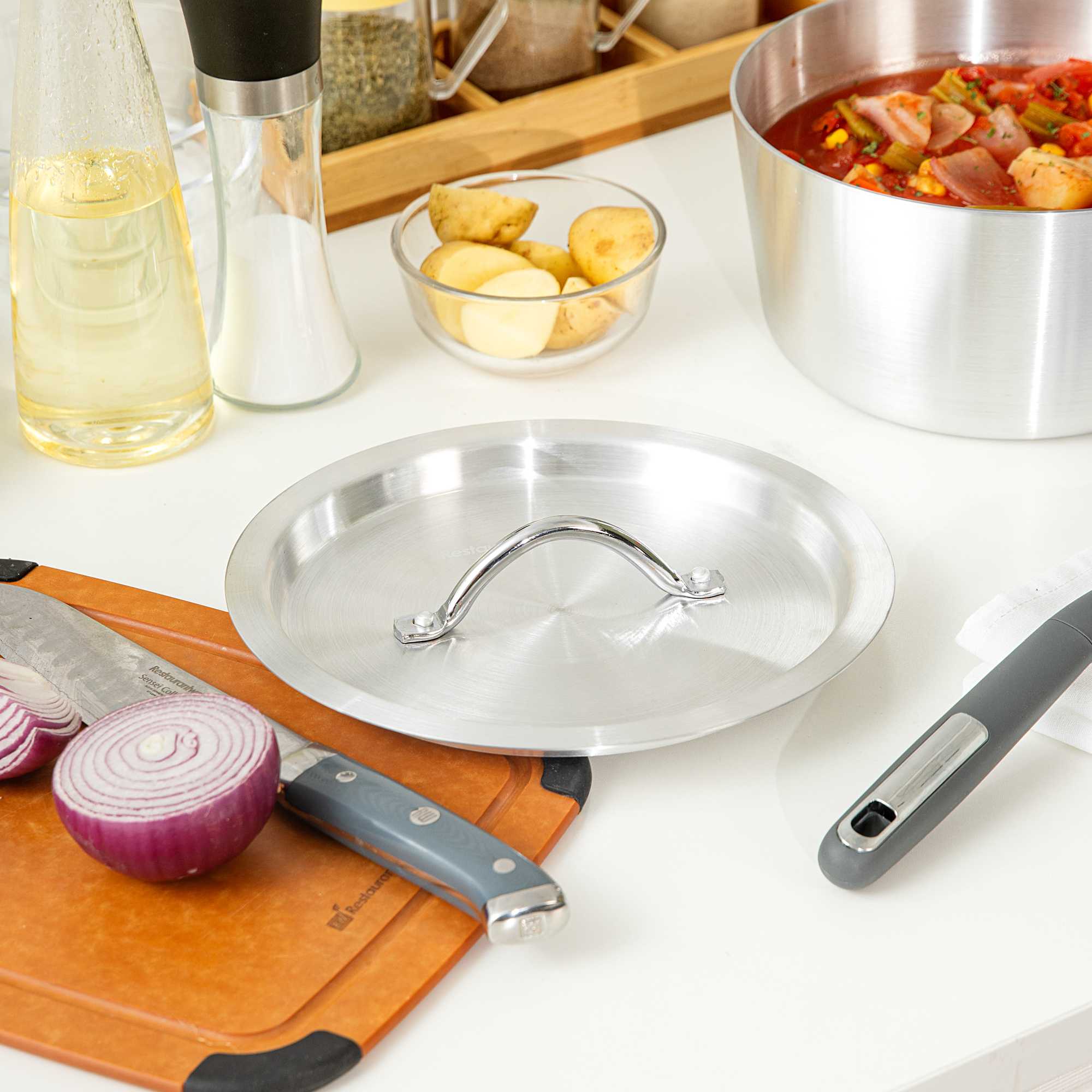 - Aluminum lid seals in heat, reduces spatter, maintains moisture