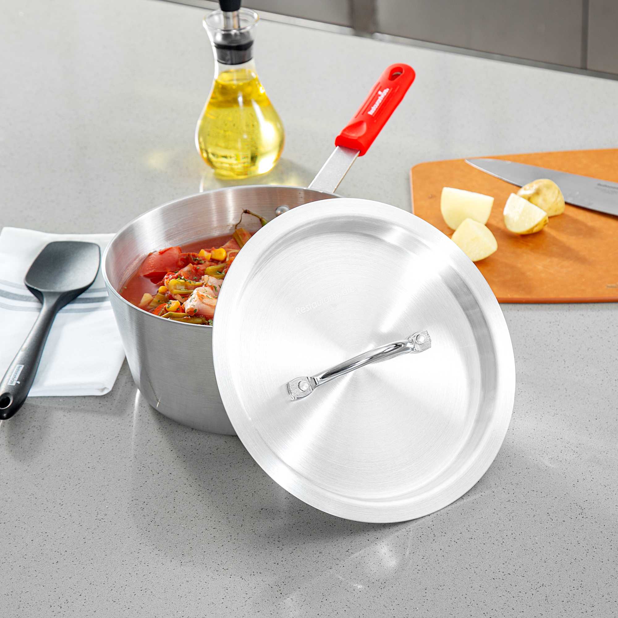 Enhance your kitchen's efficiency with superior heat retention. The Met Lux Heat-Sealing Aluminum Saucepan With Lid features an expertly designed aluminum lid that seals in heat and reduces spatter, keeping your cooking area clean and safe. This aluminum lid offers a secure fit on 3.75 quart sauce pans (sold separately) and traps heat and moisture, promoting faster and more consistent cooking results. Its easy-grab handle is designed to reduce the risk of burns when using a hot pad or towel, adding an extra layer of safety in bustling kitchens. With dimensions of 9.53 inches by 9.53 inches, this oven safe pan is built to withstand high temperatures, ensuring versatile cooking options. The nonstick aluminum construction is resistant to warping and corrosion, providing durability for daily use while maintaining a professional appearance. Equip your kitchen with this indispensable tool for efficient meal preparation. Sold in a 12 count box.