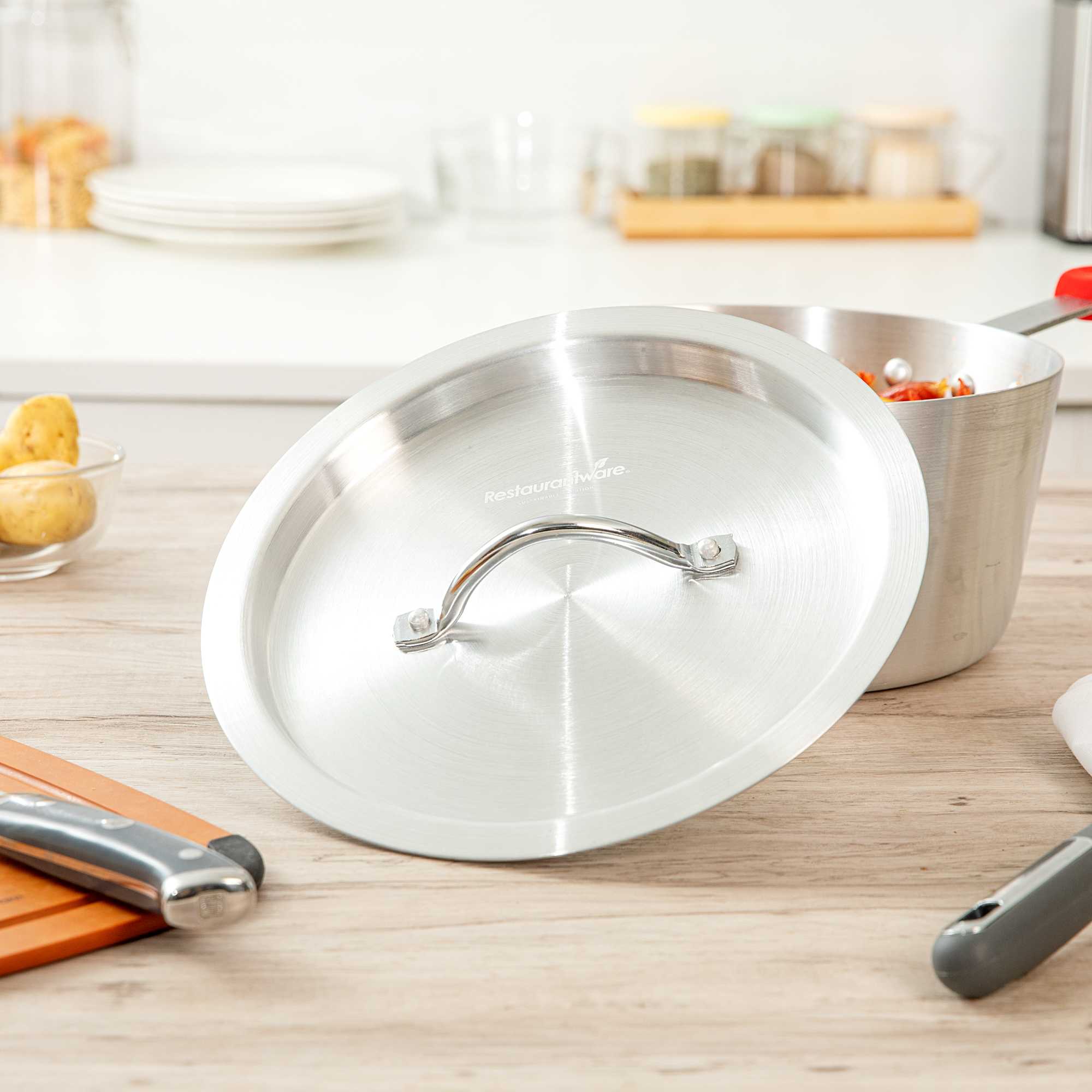 Ensure efficient and clean cooking with our aluminum pan lid. The Met Lux Heat-Retaining Aluminum Pan Lid effectively seals in heat to reduce spatter and spills, ensuring a tidy cooking environment. Made of corrosion-resistant aluminum, this oven safe lid fits securely on 4.5 quart sauce pans (sold separately) and measures 10.16 inches in width to trap heat and moisture, enhancing cooking efficiency. Designed with an easy-to-grab handle, this pan lid with handle minimizes the risk of burns by allowing easy gripping with a hot pad or towel. Its lightweight yet sturdy construction resists warping, making it a reliable choice for everyday kitchen use. This silver lid not only provides a clean, professional appearance but is also convenient for quick and frequent use, thanks to its oven-safe capabilities. Enhance your kitchen's functionality with this essential aluminum pan lid. Sold in a 1 count box.