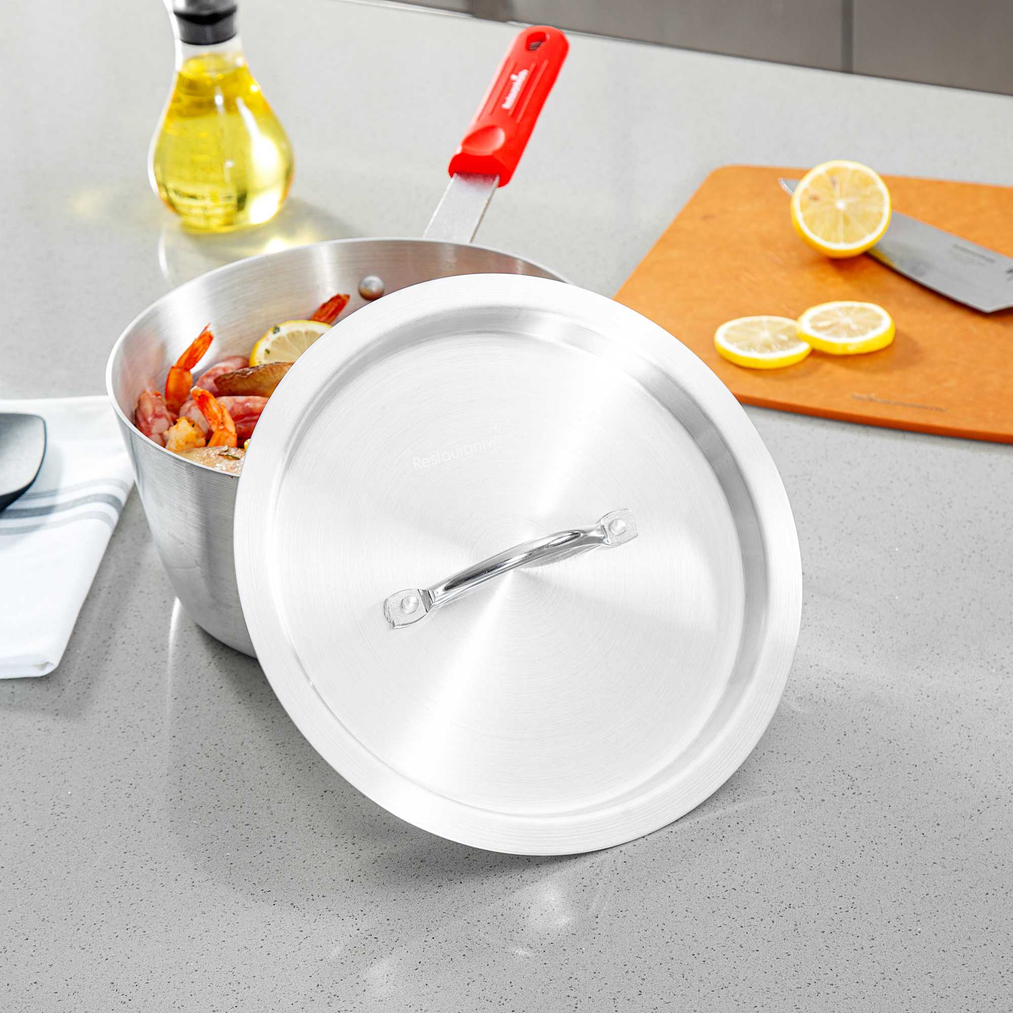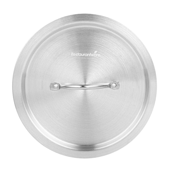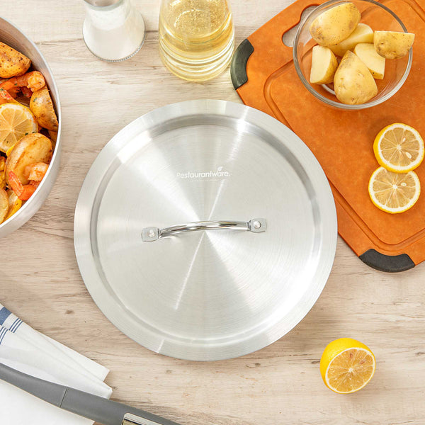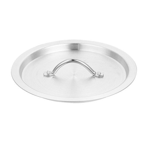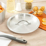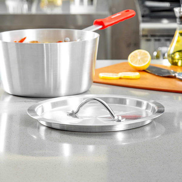 Ensure efficient and clean cooking with our aluminum pan lid. The Met Lux Heat-Retaining Aluminum Pan Lid effectively seals in heat to reduce spatter and spills, ensuring a tidy cooking environment. Made of corrosion-resistant aluminum, this oven safe lid fits securely on 4.5 quart sauce pans (sold separately) and measures 10.16 inches in width to trap heat and moisture, enhancing cooking efficiency. Designed with an easy-to-grab handle, this pan lid with handle minimizes the risk of burns by allowing easy gripping with a hot pad or towel. Its lightweight yet sturdy construction resists warping, making it a reliable choice for everyday kitchen use. This silver lid not only provides a clean, professional appearance but is also convenient for quick and frequent use, thanks to its oven-safe capabilities. Enhance your kitchen's functionality with this essential aluminum pan lid. Sold in a 12 count box.