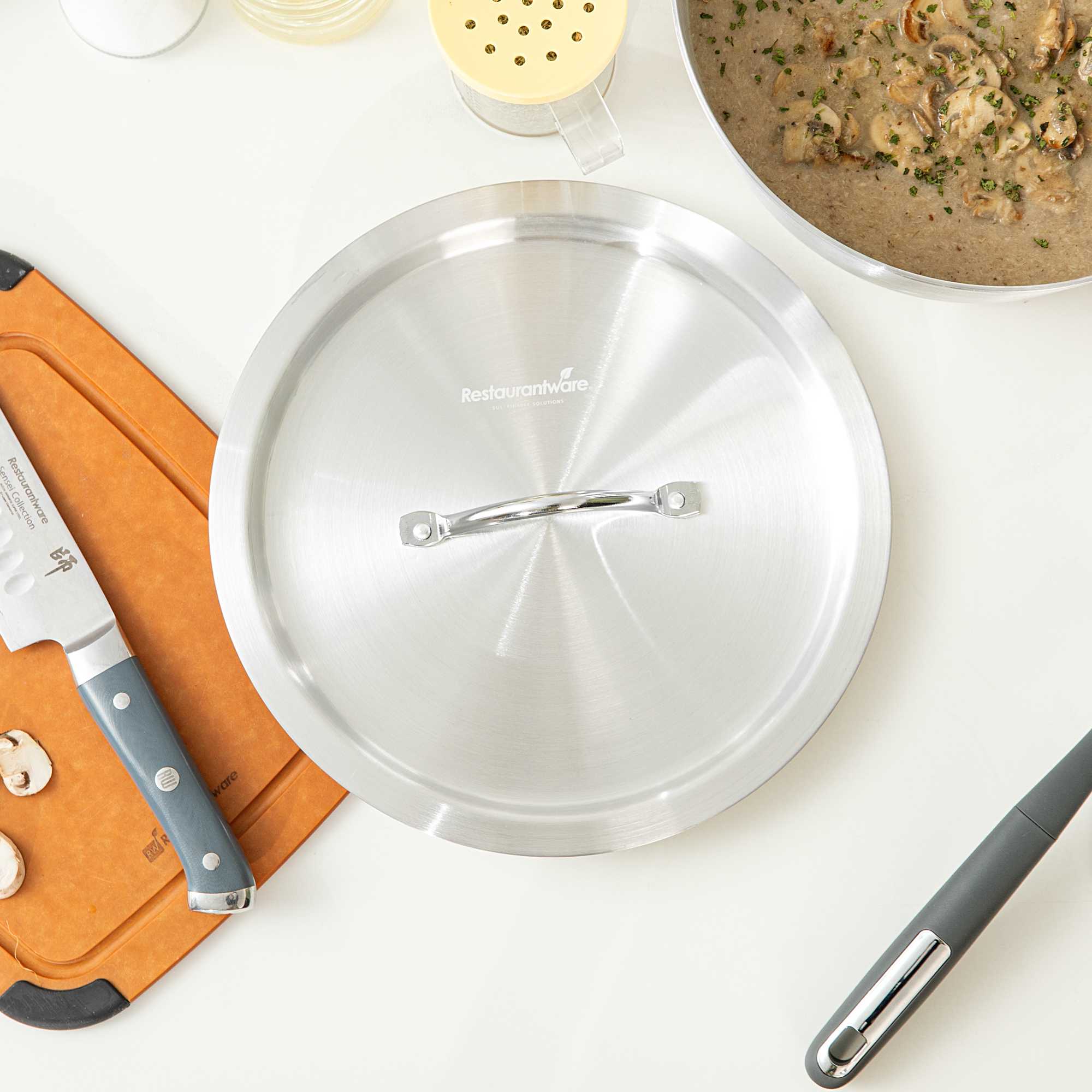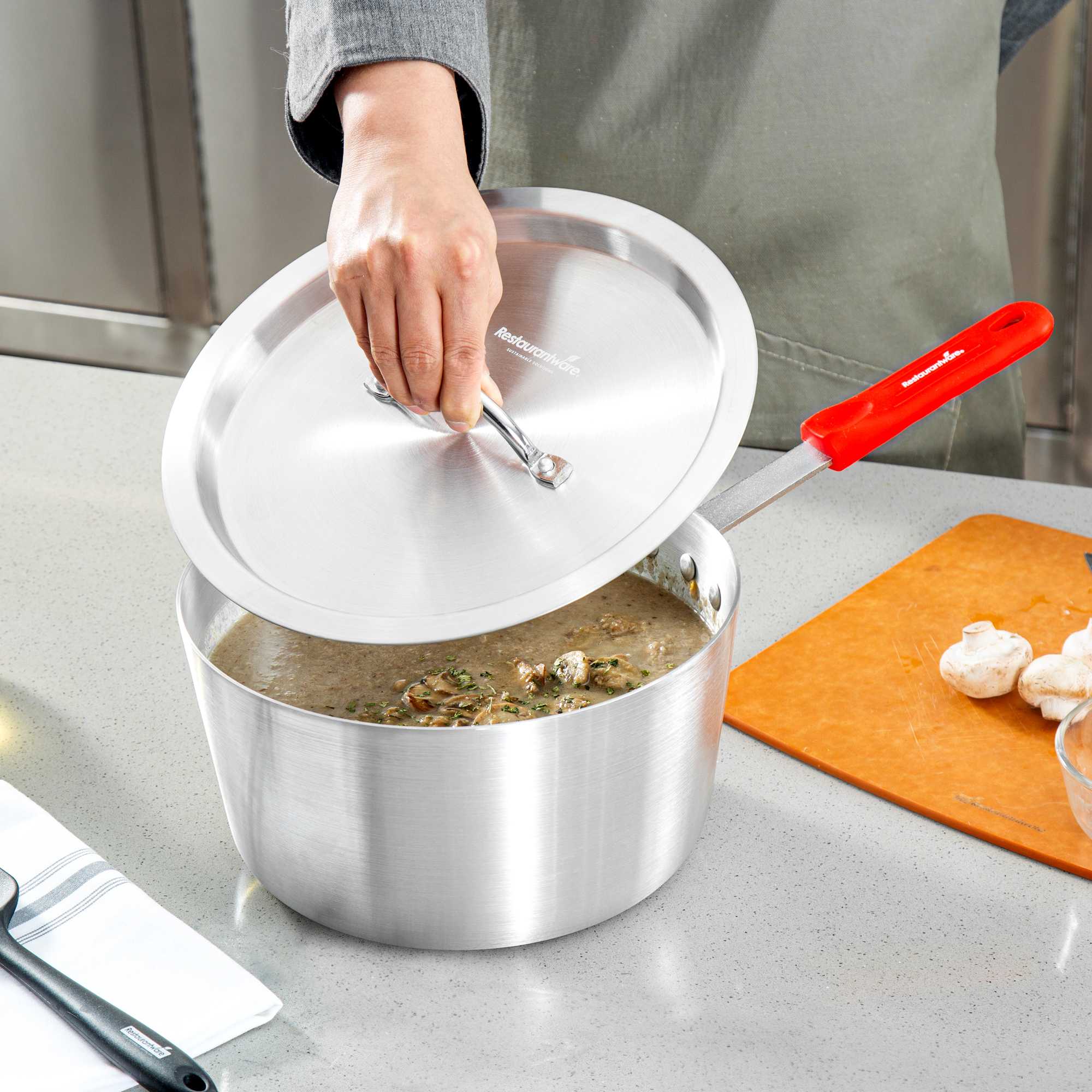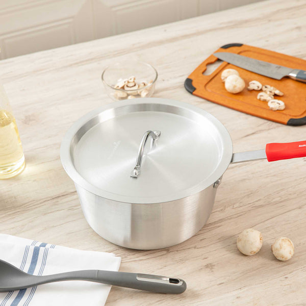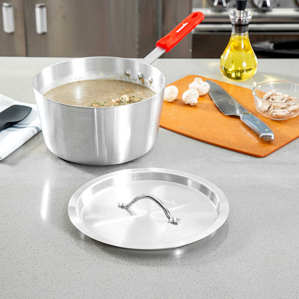 Enhance cooking efficiency with our heat-sealing solutions. The Met Lux Aluminum Saucepan Cover expertly seals in heat, reducing spatter and preserving the contents of your saucepan during cooking. Crafted from warp-resistant aluminum, this oven safe lid measures 11.18 inches in diameter and fits securely on 5.5 quart sauce pans (sold separately) to trap heat and moisture, making it an essential tool for versatile cooking applications. The warp-resistant cover ensures durability, resisting corrosion for everyday kitchen use, while the easy-to-grab handle is designed for easy gripping with a hot pad or towel, minimizing the risk of burns. Its lightweight construction facilitates easy handling, and its professional silver finish offers a clean, polished look, ideal for any culinary setting. Optimize your cookware with this aluminum saucepan cover, designed for performance and reliability. Sold in a 1 count box.