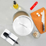 - Aluminum lid seals in heat, reduces spatter, maintains moisture