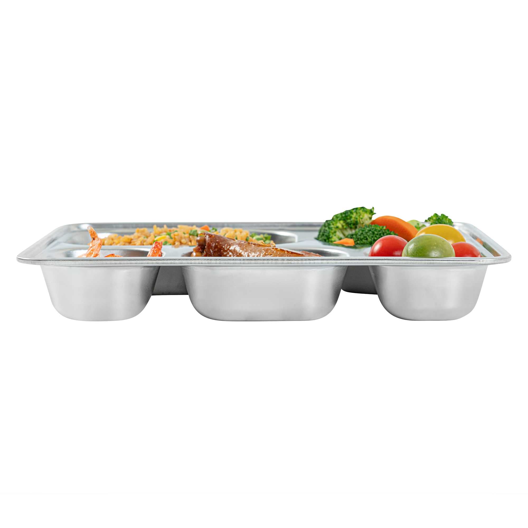 Enhance meal presentation with our Met Lux Ambidextrous Rectangle Stainless Steel Trays. Crafted from durable stainless steel, this cafeteria food tray is designed with a five-section layout that simplifies portion control and elevates food presentation, making it ideal for foodservice settings. The ambidextrous design ensures comfortable and efficient use for both left- and right-handed users, enhancing versatility in fast-paced kitchen settings. Its dishwasher-safe feature ensures quick, sanitary clean-up, enhancing operational efficiency in bustling cafeterias. With dimensions of 11.0 inches in length, 8.6 inches in width, and 1.6 inches in height, this tray provides ample space for a variety of dishes while maintaining a sleek, stackable design for convenient storage. Sold in a 2 count box.