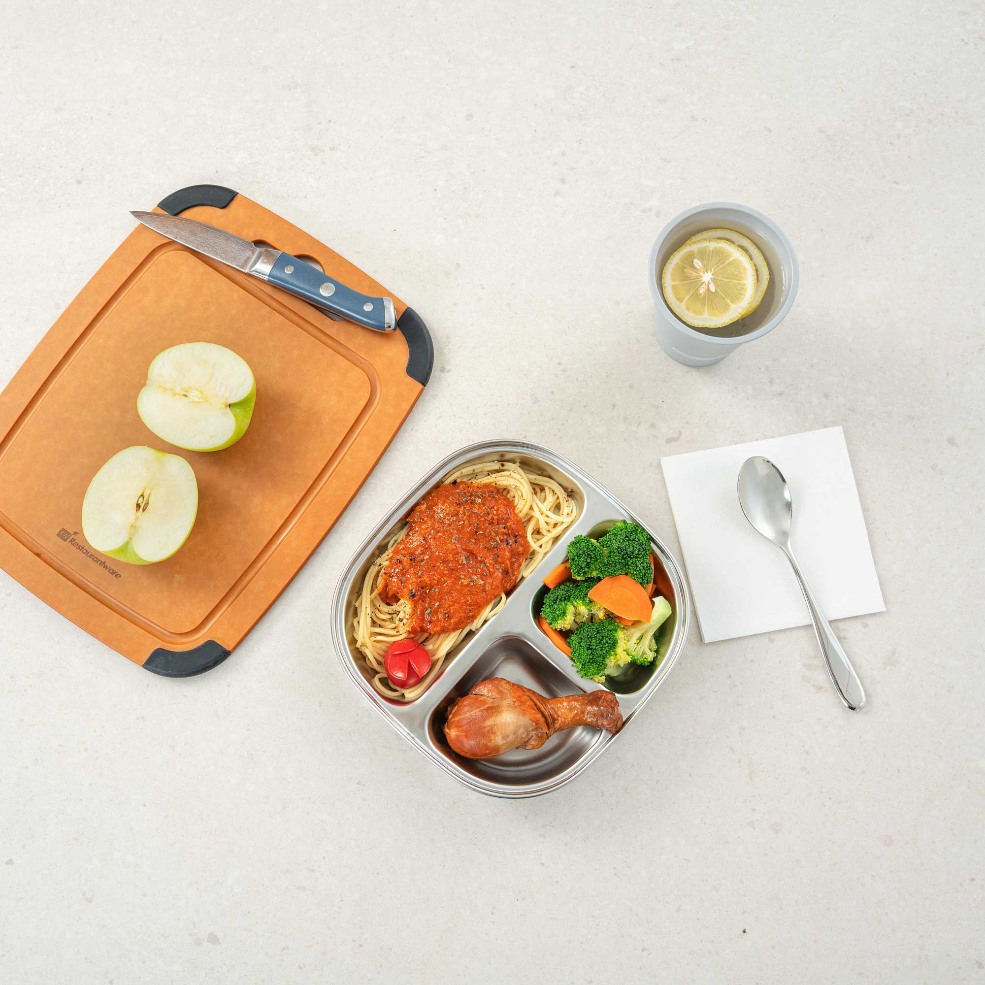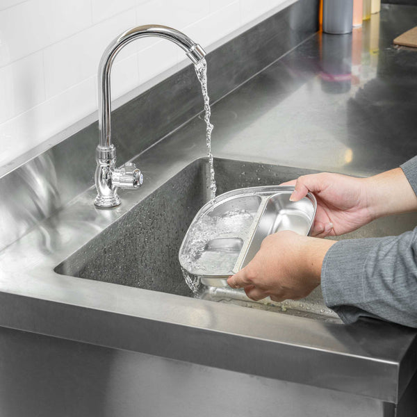 Enhance meal presentation with our Met Lux Ambidextrous Square Stainless Steel Trays. Expertly crafted from durable stainless steel, this food tray features a three-compartment layout that supports organized plating and portion control, ideal for cafeterias, catering services, and institutional dining. Its ambidextrous design accommodates both left- and right-handed users, offering a practical solution for high-traffic foodservice settings. Built for commercial use, this tray is dishwasher-safe to allow for fast cleanup. Measuring 7.68 inches in length, 7.68 inches in width, and 1.65 inches in height, its compact square profile delivers space-saving stackability while offering just the right amount of room for balanced meals. Sold in a 20 count box.
