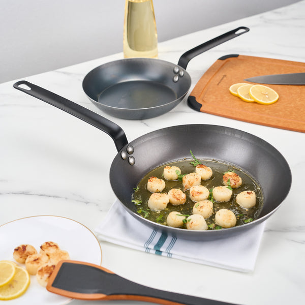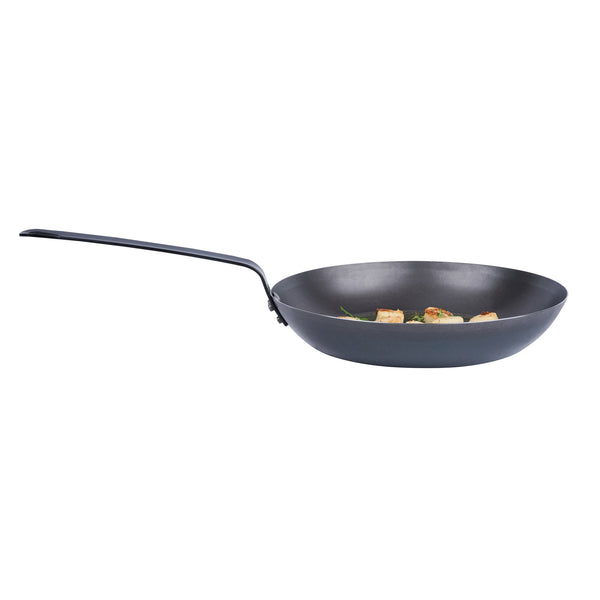 Enhance your kitchen's versatility with induction-safe cookware. The Met Lux Carbon Steel Skillet is engineered with 1.5 millimeters of thick carbon steel, ensuring robust durability even in the most demanding culinary settings, making it an essential carbon steel skillet for professional chefs. Its triple-riveted handle offers a secure grip, providing added durability for long-lasting use, ideal for a black steel frying pan that withstands continuous handling. Designed to accommodate versatile cooking styles, this induction-safe skillet is perfect for use on stovetops and ovens, allowing chefs to easily transition between different cooking techniques. Measuring 19.88 inches in length, this lightweight skillet promotes even heat distribution, enhancing cooking efficiency and reducing preparation time. Elevate your kitchen's capabilities with this exceptional cookware, perfect for any foodservice professional seeking reliable results. Sold in a 1 count box.