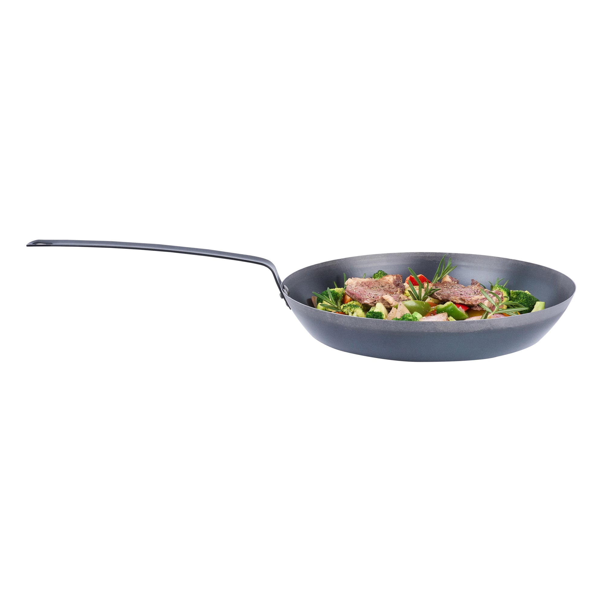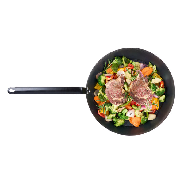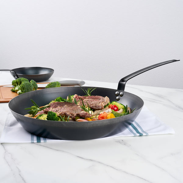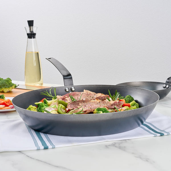 Elevate your kitchen's efficiency with versatile cookware. The Met Lux Induction-Safe Carbon Steel Skillet's 1.5 mm thick carbon steel construction ensures robust durability, perfect for demanding culinary settings. This carbon steel skillet features a triple-riveted handle, providing a secure grip and enhanced longevity, making it an essential tool for chefs who require reliability in fast-paced environments. Its induction-safe design accommodates varied cooking methods, allowing you to seamlessly integrate it with induction cooktops, traditional stoves, or even ovens. Measuring 28.54 inches in length, this induction compatible skillet offers ample space for preparing large portions while ensuring even heat distribution for perfect results every time. Its lightweight nature allows for easy handling, while its durable steel material withstands the rigors of continuous use. Sold in a 1 count box.