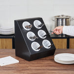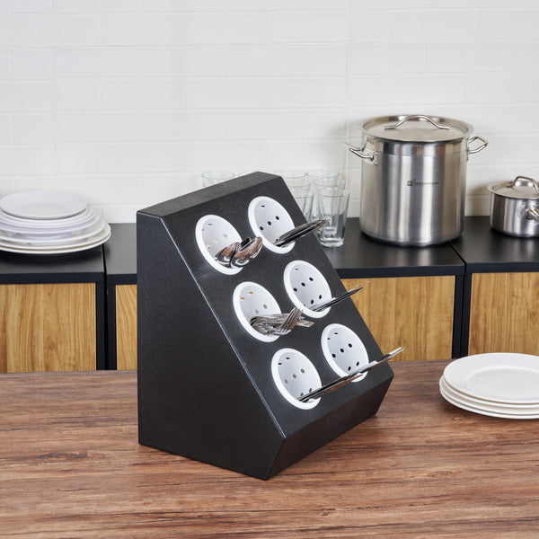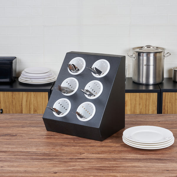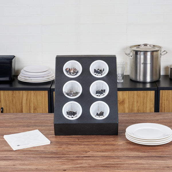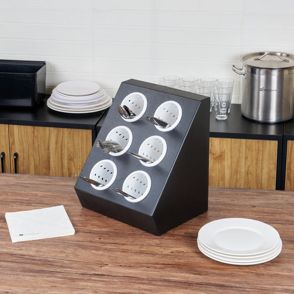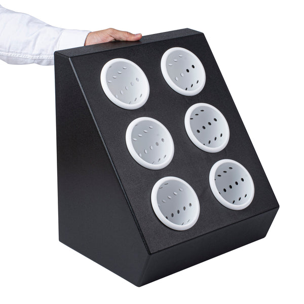 Streamline utensil management in your restaurant with our Met Lux Black Plastic Flatware Organizer. Designed with 6 holes, this flatware holder keeps utensils neatly organized and easily accessible for quick service in busy restaurant environments. This flatware caddy comes with 6 plastic cylinders that fit perfectly into the designated slots, ensuring durability and easy cleaning while maintaining a polished look. The perforated exterior of the cylinders enables proper ventilation, preventing the accumulation of moisture and keeping utensils dry and hygienic for optimal use. Featuring an easily accessible angled design, this silverware holder allows for quick retrieval of utensils while maximizing efficiency in bustling dining environments. Crafted from premium plastic, this flatware storage ensures long-lasting durability, making it ideal for daily use in high-traffic restaurant settings. Measuring 13.78 inches in length by 11.42 inches in width by 15.94 inches in height, this flatware organizer fits perfectly into your kitchen or dining area. Sold in a 1 count box.