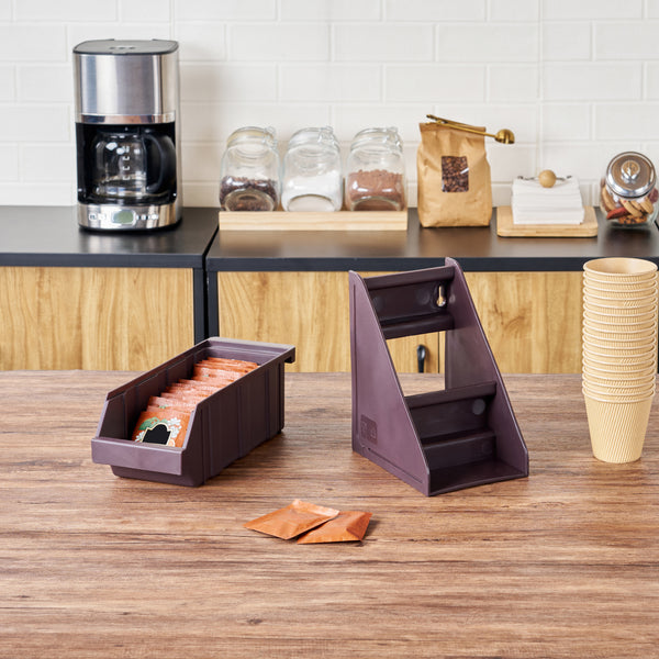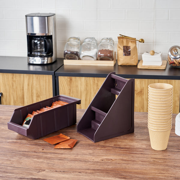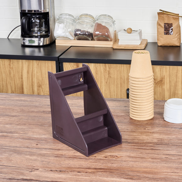 Enhance your foodservice setup with our Met Lux Brown Plastic 2-Tier Stand. Ideal for self-serve beverage stations or take out order preparation stations, this durable stand offers unparalleled convenience. This plastic stand's vertical design takes up minimal space on your countertop, maximizing efficiency. Additionally, you can combine this brown stand with other stands using connector clips for a customizable setup. The brown finish of this stand blends with various decor for a stylish look. Measuring 7.68 inches in length by 5.59 inches in width by 9.09 inches in height, this brown plastic stand fits seamlessly into any kitchen or service area. Sold in a 1 count box. Stand and connector clips are available and sold separately.
