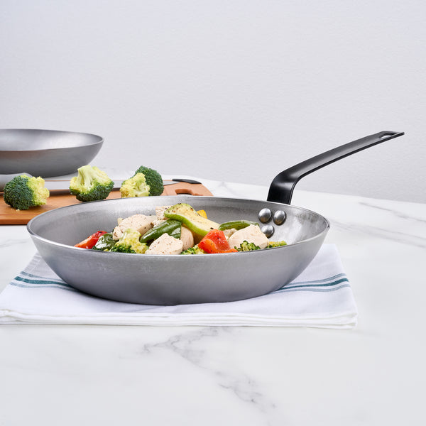 Achieve exceptional cooking performance with our Met Lux Carbon Steel Fry Pan. This carbon steel fry pan boasts a robust 3 millimeter thick construction, ensuring durability and resilience in demanding kitchens. Its black steel skillet surface is pre-seasoned, providing a natural non-stick layer that reduces the need for excessive oils and promotes healthier cooking. Designed with a triple-riveted ergonomic handle, it offers a secure grip that enhances maneuverability and minimizes hand fatigue during extended use. The induction-safe fry pan accommodates diverse cooking styles, making it suitable for gas, electric, and induction stovetops. Measuring 10 inches in diameter, this versatile pan is perfect for searing meats and preparing delicate dishes like omelets. The oven-safe feature broadens your culinary options, allowing seamless transitions from stovetop to oven. Enhance your kitchen’s efficiency with this essential cookware. Each order includes 1 Met Lux Carbon Steel Fry Pan.