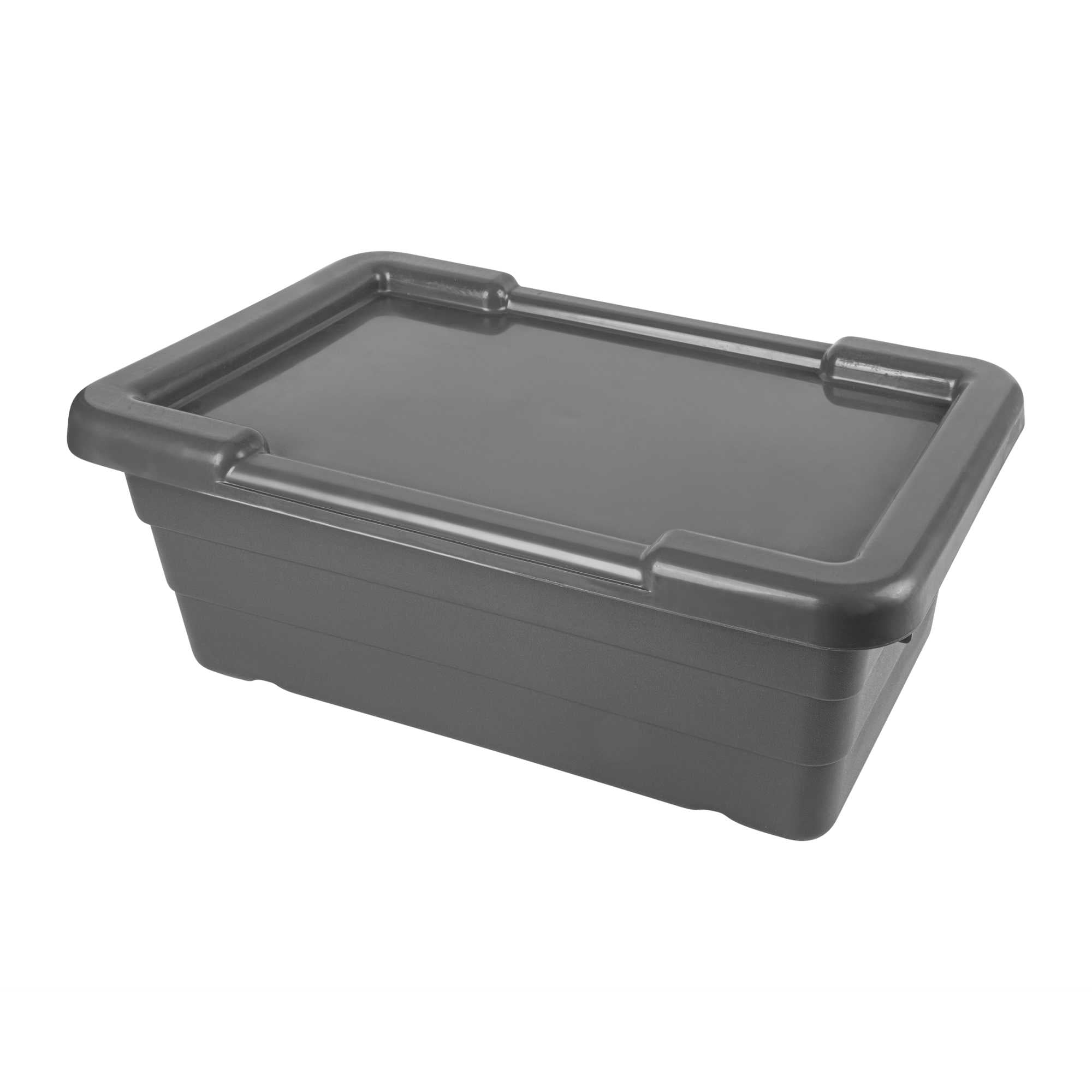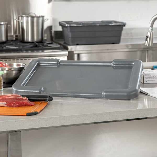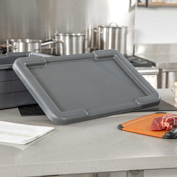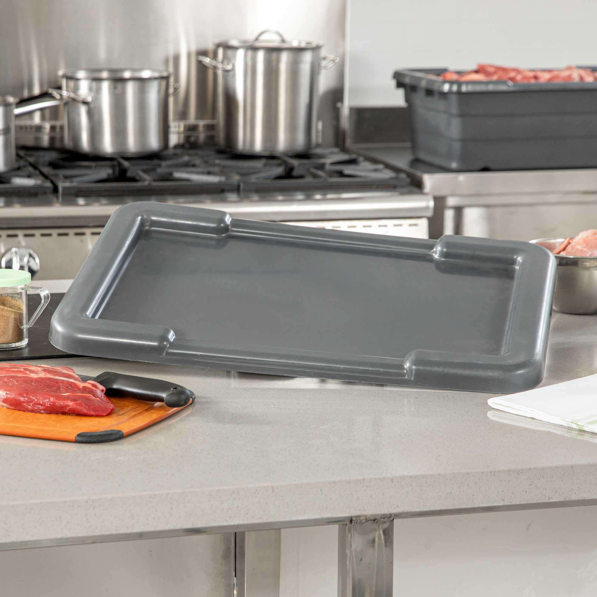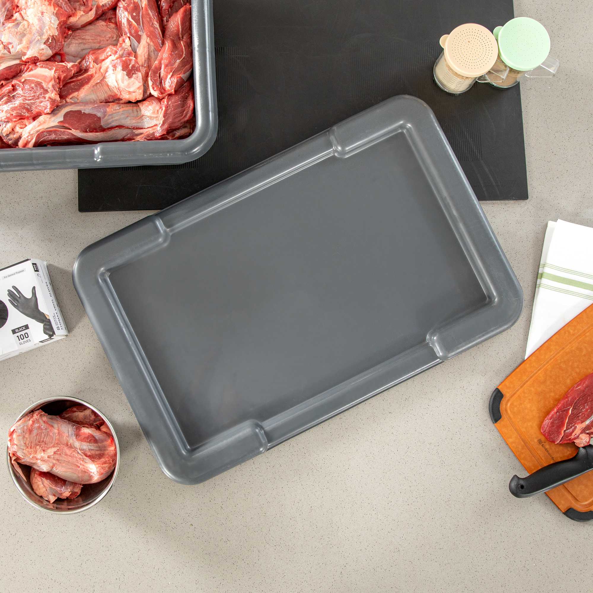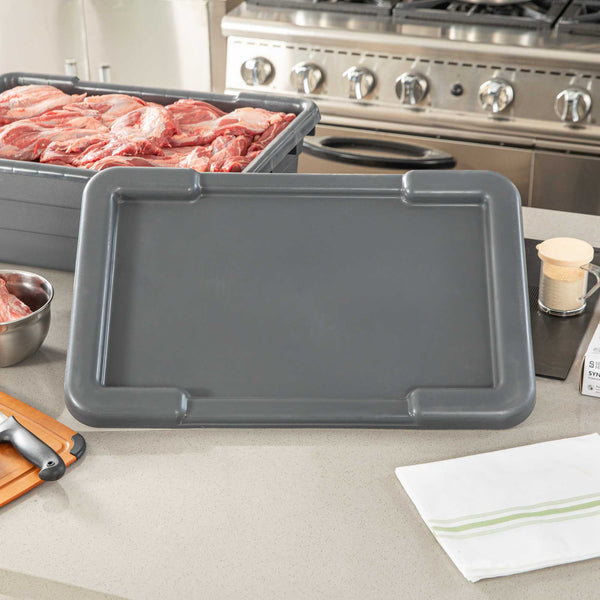 Ensure superior protection with the Met Lux Dark Gray Stackable Meat Lug Lid. This plastic lid for meat lug features a recessed design with a raised rim, ensuring secure stacking and maximizing your storage space efficiently. Its dishwasher-safe construction simplifies cleaning processes, saving valuable time in busy kitchens and making it an ideal food storage lid. With dimensions of 15.9 inches in width, it effectively prevents the spread of germs and bacteria while keeping unpleasant odors contained, crucial for maintaining high foodservice standards. Elevate your kitchen's efficiency and hygiene with this essential meat lug lid. Each order includes 10 Met Lux Dark Gray Stackable Meat Lug Lid.