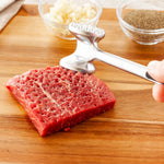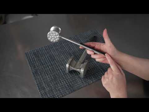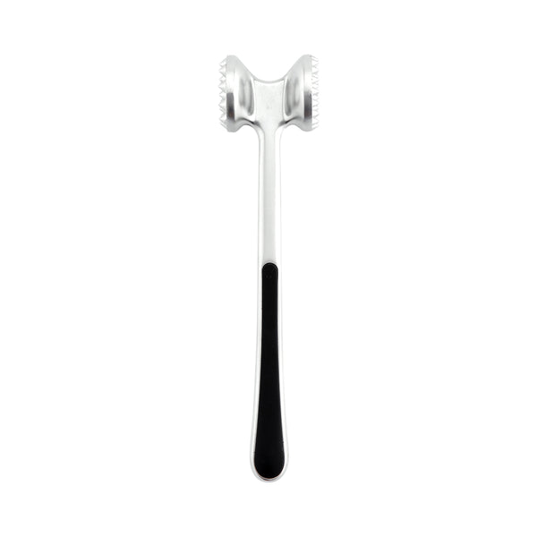 Soften your tough cutlets with our Met Lux Professional Meat Tenderizer. This double-sided meat hammer has 16 raised nails on one side of the head and 37 raised nails on the other for different degrees of tenderizing. The weighted head of this professional meat tenderizer tool makes it easy to pound out chicken breasts without applying too much pressure. Designed with a black, non-slip plastic handle, this meat pounder provides a secure grip for a steady hold while prepping your steaks. Constructed from heavy-weight aluminum with a mirrored finish, this chicken hammer is corrosion-resistant to maintain its high-quality appearance in your butcher's shop, restaurant, and other foodservice establishment. To maintain its premium look, we recommend hand washing only with alkaline-free detergent or rinse with water and let it air dry. Measuring 8.6 inches long by 2 inches wide by 1.5 inches tall, this meat tenderizer's hammerhead has a 1.5-inch diameter. Sold in a 1 count box.