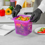 Maximize your kitchen's efficiency with versatile storage solutions. The Met Lux Stackable Plastic Food Container – 2.3 Qt, Temperature-Resistant, Reusable Label – 6.85 inches by 6.2 inches by 5.9 inches optimizes space with its stackable design, making it an ideal choice for busy foodservice environments where organization is key. This plastic food container is BPA-free, ensuring it meets stringent food safety standards while providing the durability necessary for everyday use. With its freezer-safe container capabilities, it withstands temperatures from -40 to 200 degrees Fahrenheit, making it perfect for storing both hot and cold foods without compromising quality. The container features a dishwasher-safe surface, simplifying cleaning and maintenance, freeing up valuable time for your staff. Its flexible polypropylene construction offers strength and affordability. Each order includes 1 Met Lux Stackable Plastic Food Container – Purple, Temperature-Resistant, Reusable Label.