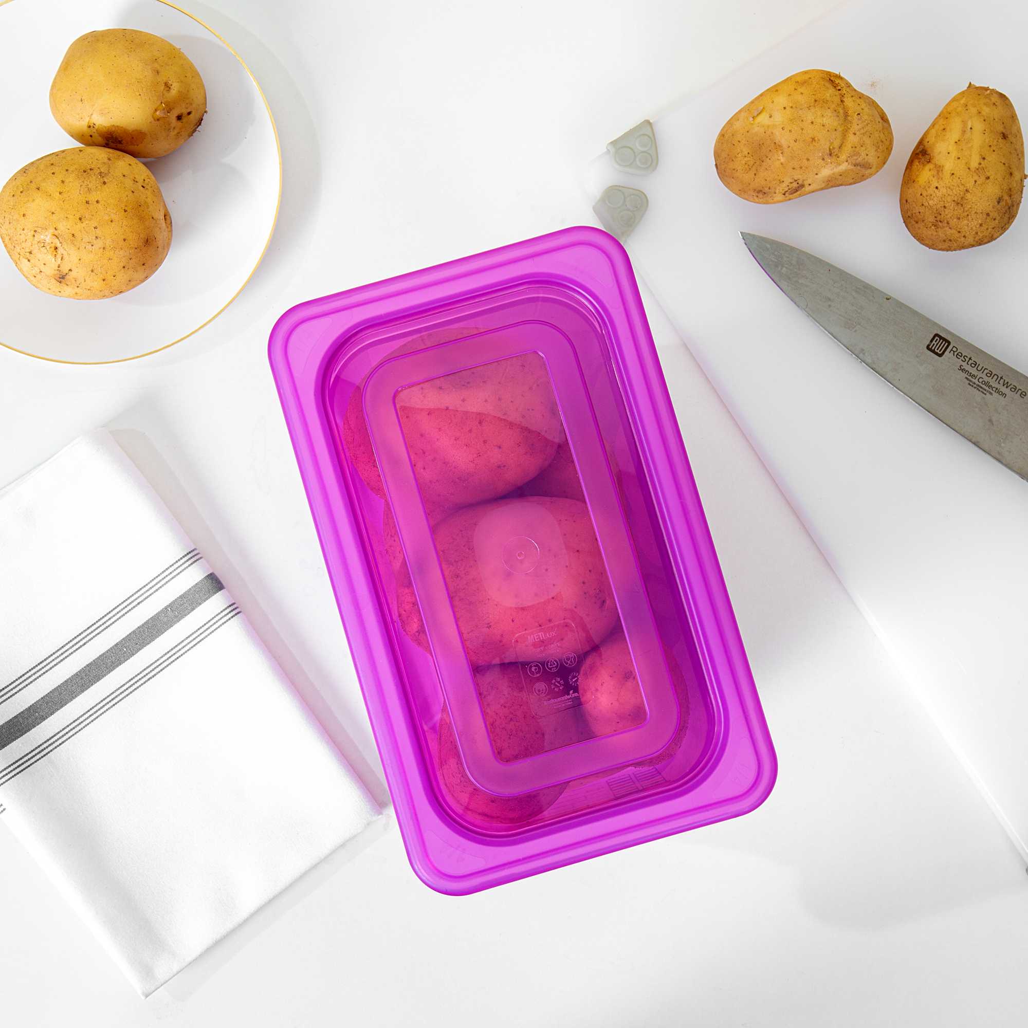 Enhance organization in your kitchen with our Met Lux Stackable Plastic Food Container Lid. Constructed from BPA-free plastic, this lid ensures safe food storage for clients, making it a reliable choice for your commercial kitchen. The polypropylene storage cover is stackable, optimizing your storage space by up to 25% compared to round containers, thus maximizing kitchen efficiency. Dishwasher-safe, it supports quick and easy cleaning, allowing your team to focus on serving delectable meals. Its durable, stain-resistant design withstands temperatures from -40 to 200 degrees Fahrenheit, suitable for both hot and cold storage. Upgrade your food storage solutions with this stackable food container lid to meet your demanding foodservice needs. Each order includes 1 Met Lux Stackable Plastic Food Container Lid.
