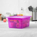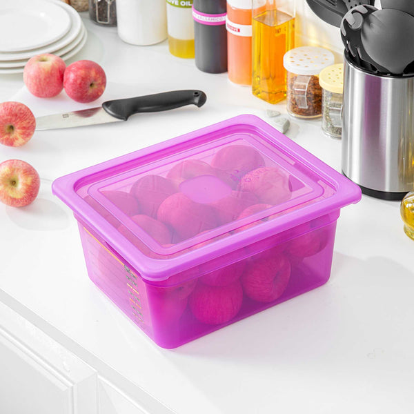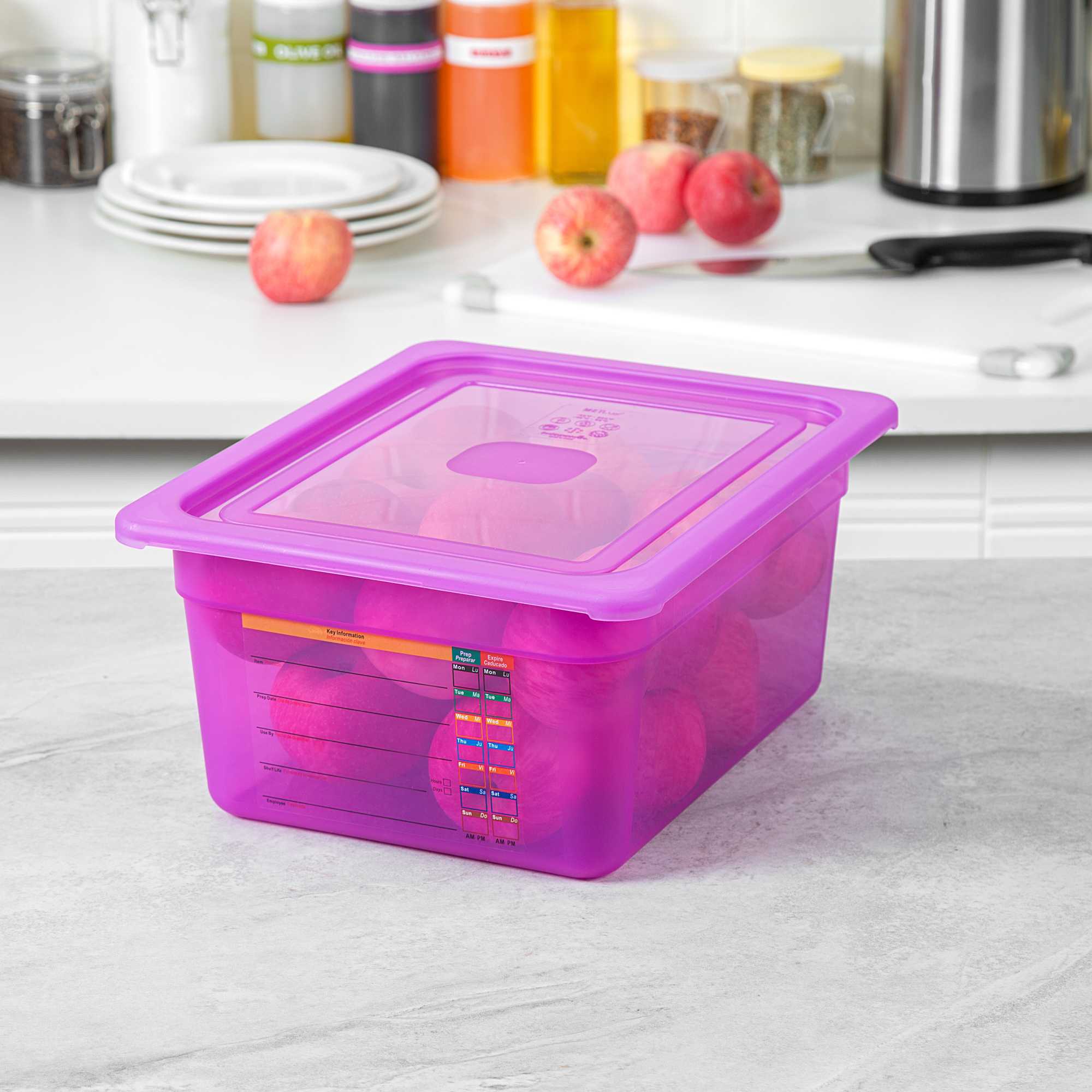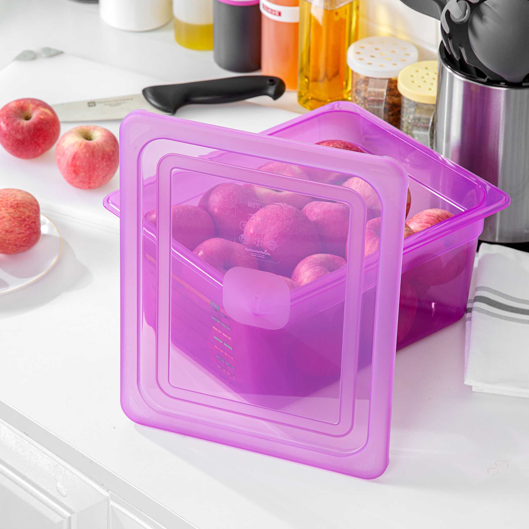 Ensure efficient kitchen operations with these versatile covers. The Met Lux Stackable Plastic Food Storage Cover – Purple, Temperature-Resistant – 12.7 inches by 10.5 inches boasts a BPA-free design, providing safe food storage for your establishment. This plastic food storage cover can be easily washed off in the dishwasher, reducing costs and waste by eliminating the need for disposable labels. Its stackable form optimizes kitchen storage space, allowing you to maximize organization and accessibility. Made from flexible polypropylene, it is durable, stain-resistant, and can withstand temperatures ranging from -40 to 200 degrees Fahrenheit, making it hot food-friendly and cold food-friendly. Use it to store ingredients or fully prepared food with confidence. Each order includes 1 Met Lux Stackable Plastic Food Storage Cover.
