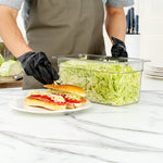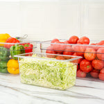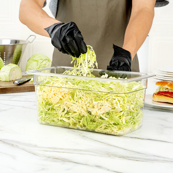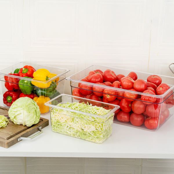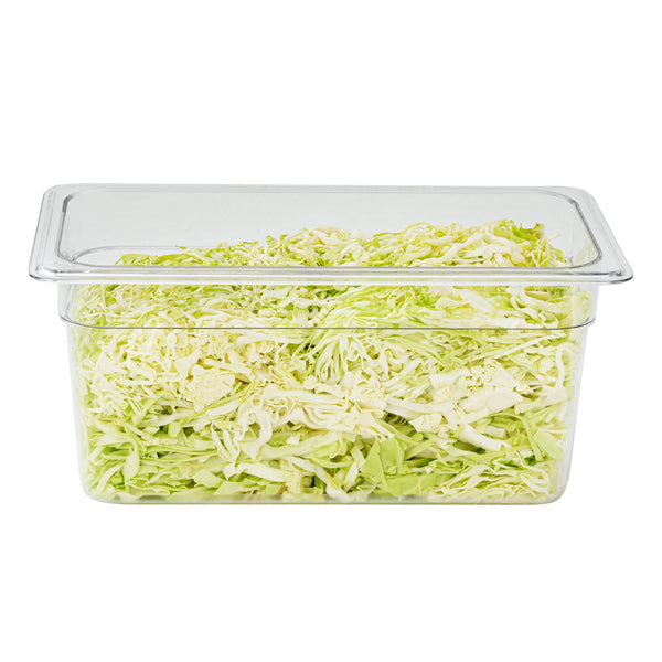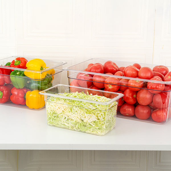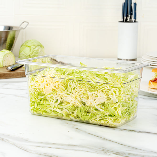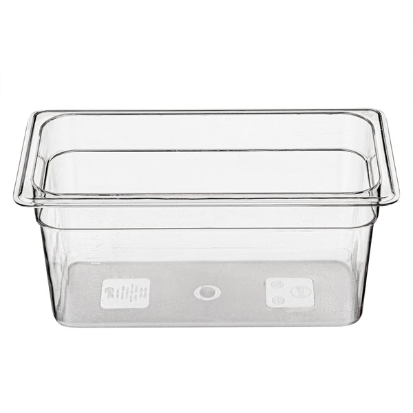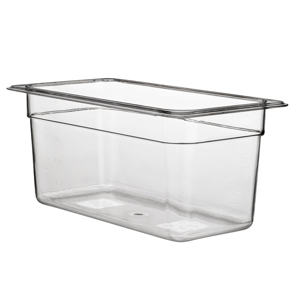 Store freshly cut garnishes or prepared dishes using our Met Lux Rectangle Clear Plastic 1/3 Size Cold Food Storage Container. This food pan has volume markers listed in quarts and liters which allow you to conveniently measure, portion, and store ingredients. Featuring a clear finish, this rectangular storage container provides your employees with an easy way to identify products in freezers or refrigerators. With a durable design, this shatterproof food pan avoids odors and stains to endure rigorous use and maintain its clarity. This plastic kitchen storage container has a 6-inch depth, making them excellent for displaying lettuce, fruits, or garnishes at your salad bar. Coordinate this dishwasher-safe food container with our compatible lids (SKU: RWT0071) to eliminate messes when transporting ingredients throughout your busy kitchen. This clear kitchen container is stackable for space-efficient storage at your bar, catered event, or restaurant. Containing up to 5.6 quarts, this food container measures 12.8 inches long by 6.9 inches wide. Sold in a 1 count box. Lids are available and sold separately.