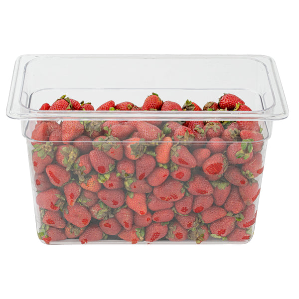 Store prepped ingredients in your commercial refrigerator or freezer using our Met Lux Rectangle Clear Plastic 1/3 Size Cold Food Storage Container. With graduations listed in quarts and liters, this commercial food storage container provides your staff with an easy way to measure ingredients and keep track of inventory at your foodservice establishment. This rectangle food container has an 8-inch depth, allowing you to display your toppings in salad bars or cold holding wells. Featuring a clear finish, this kitchen storage pan provides you with full visibility to quickly identify garnishes in your refrigerator or storage room. This plastic food container stands up to food acids and oils to maintain its exceptional design for long-lasting use. Conveniently compatible with commercial dishwashers, this freezable food pan provides a quick and effortless way to clean up during busy shifts. Pair this clear food pan with our compatible lid (SKU: RWT0071) to preserve the freshness of toppings for longer. This food storage container is conveniently stackable for quick and simple storage in your kitchen or prep room. Measuring 12.8 inches long by 6.9 inches wide and 8 inches tall, this gastronorm pan can contain up to 7.3 quarts and is shipped in a 1 count box. Lid is sold separately.