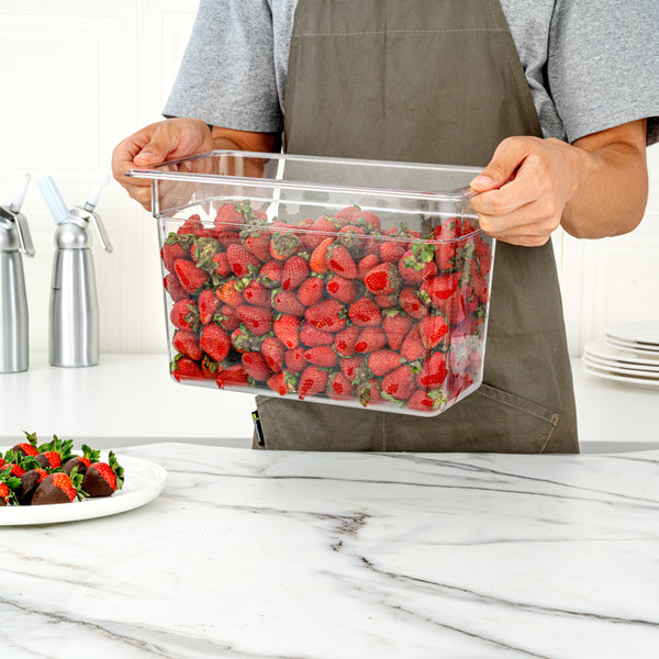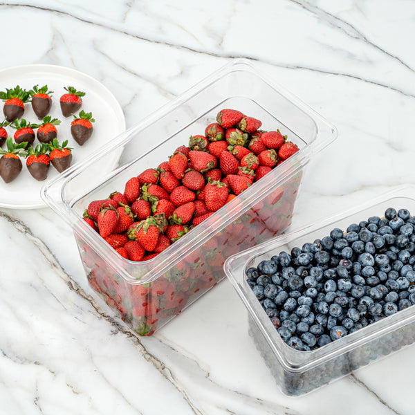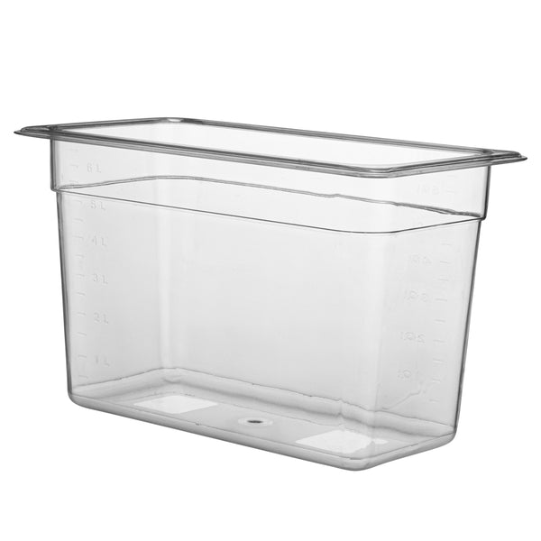 Store prepped ingredients in your commercial refrigerator or freezer using our Met Lux Rectangle Clear Plastic 1/3 Size Cold Food Storage Containers. With graduations listed in quarts and liters, these commercial food storage containers provide your staff with an easy way to measure ingredients and keep track of inventory at your foodservice establishment. These rectangle food containers have an 8-inch depth, allowing you to display your toppings in salad bars or cold holding wells. Featuring a clear finish, these kitchen storage pans provide you with full visibility to quickly identify garnishes in your refrigerator or storage room. These plastic food containers are resistant to food acids and oils to maintain their exceptional design for long-lasting use. Conveniently safe for commercial dishwasher use, these freezer-safe food pans provide a quick and effortless way to clean up during busy shifts. Pair these clear food pans with our compatible lids (SKU: RWT0071) to preserve the freshness of toppings for longer. These food storage containers are conveniently stackable for quick and simple storage in your kitchen or prep room. Measuring 12.8 inches long by 6.9 inches wide and 8 inches tall, these gastronorm pans can contain up to 7.3 quarts and are shipped in a 10 count box. Lids sold separately.