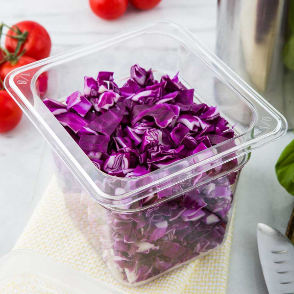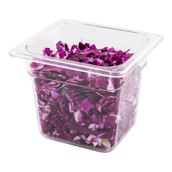 Organize bulk ingredients with our 1/6 size Clear Plastic Cold Food Storage Container. With a premium plastic construction, this durable kitchen container provides long-lasting storage at your restaurant, buffet, cafe, and more. With a crystal clear finish, this plastic food storage offers easy visibility of all your flavorful ingredients. This 6 inch deep plastic storage box is ideal for storing chopped produce in your refrigerator or dry ingredients in your kitchen pantry. Seal up your fresh ingredients with our coordinating lid (SKU: RWT0073). Lid sold separately. Measuring 7 inches long by 6.4 inches wide, this plastic food container ships in a 1 count box.