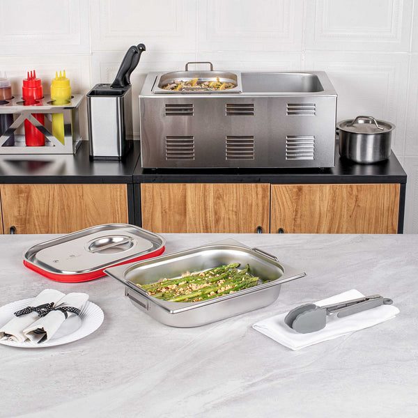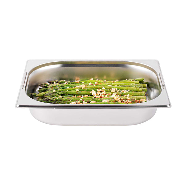 Make the most of your steam table pans with our Met Lux 1/2 Size Anti-Jam Stainless Steel Steam Table Pans with Collapsible Handles. Equipped with built-in retractable handles, these half size steam table pans make it effortless to transfer prepared foods to and from your steam table. Their reinforced corners are designed to resist warping or breakage, and their impact-resistant stainless steel construction ensures reliable and long-term commercial use. These half hotel pans with handles are also equipped with an innovative anti-jam design to enable efficient and hassle-free storage. Measuring 2.5 inches deep, these half size steam pans are great for serving medium-sized portions of hot or cold appetizers, salads, side dishes, and entrees at catered events and buffets. Pair these freezer-safe and oven-safe steam table pans with lids to complete your mess-free and portable food holding solution. Choose between our spill-resistant travel lids (SKU: RWT0052) or our traditional lids (SKU: RWT0046). Lid sold separately. Each order will contain one 12.8-inch L x 10.4-inch W x 2.5-inch H steam table pan.