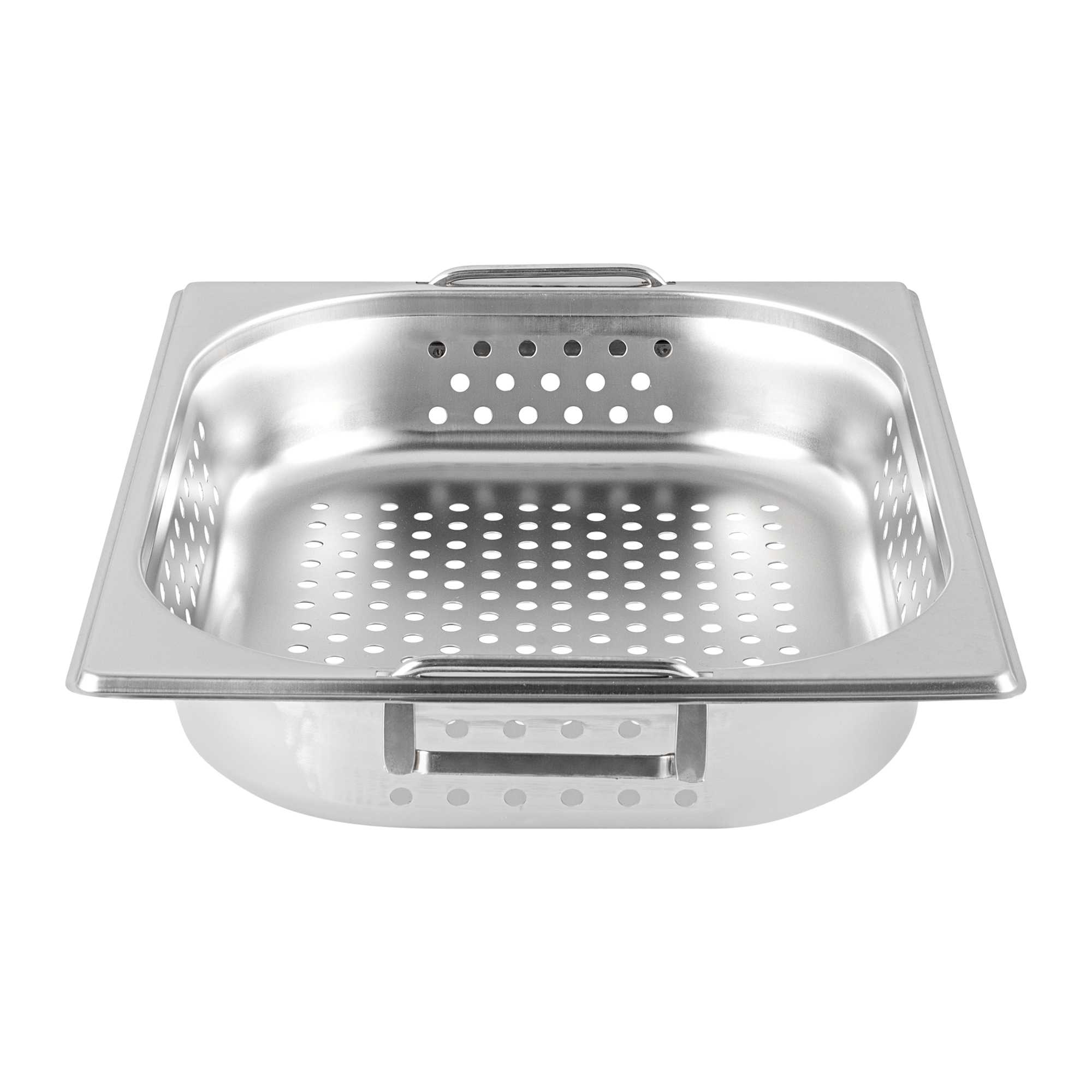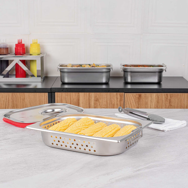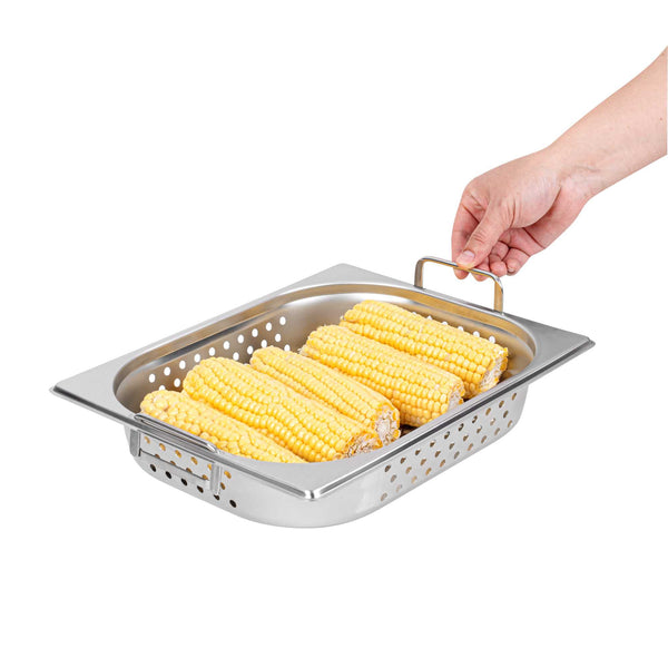 Upgrade your steam table pans with our Met Lux 1/2 Size Anti-Jam Perforated Stainless Steel Steam Table Pans with Collapsible Handles. These stainless steel steam pans are designed with innovative collapsible handles that make it effortless to transport and load your prepared foods. Their reinforced corners expertly resist warping or breakage, while their impact-resistant stainless steel body ensures long-term commercial use. Manufactured from high-quality stainless steel, these half hotel pans are designed to withstand high heat applications and are conveniently freezer and oven-safe. These steam table pans with handles also feature a unique anti-jam design that enables quick and hassle-free storage. Use these 2.5 inch deep perforated hotel pans to perfectly steam, drain, or warm medium-sized portions of your prepared foods. Pair these steam table pans with our spill-resistant travel lids (SKU: RWT0052) or our traditional lids (SKU: RWT0046) to complete the look. Lids sold separately. Each order will contain one 12.8-inch L x 10.4-inch W x 2.5-inch H perforated half size steam table pan.