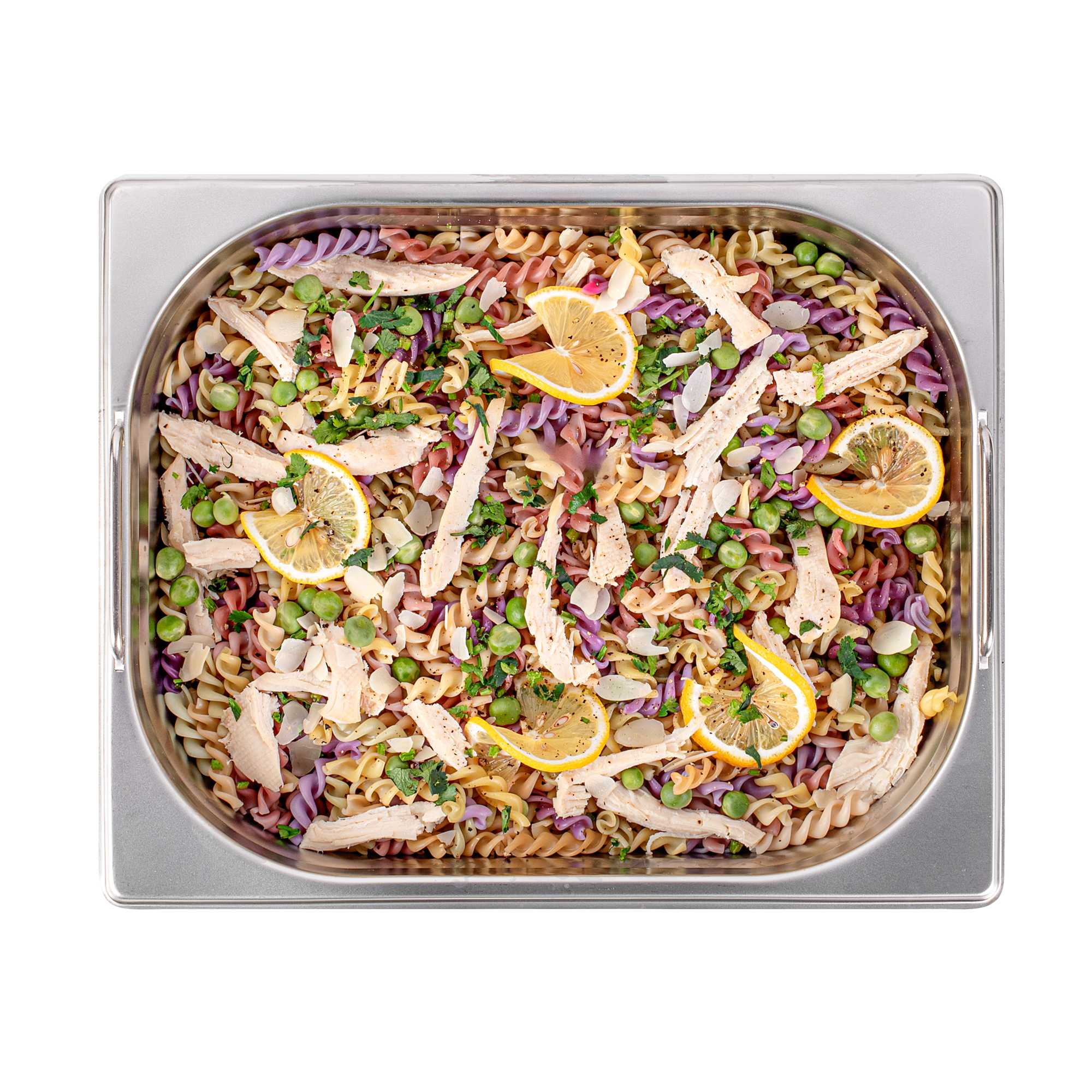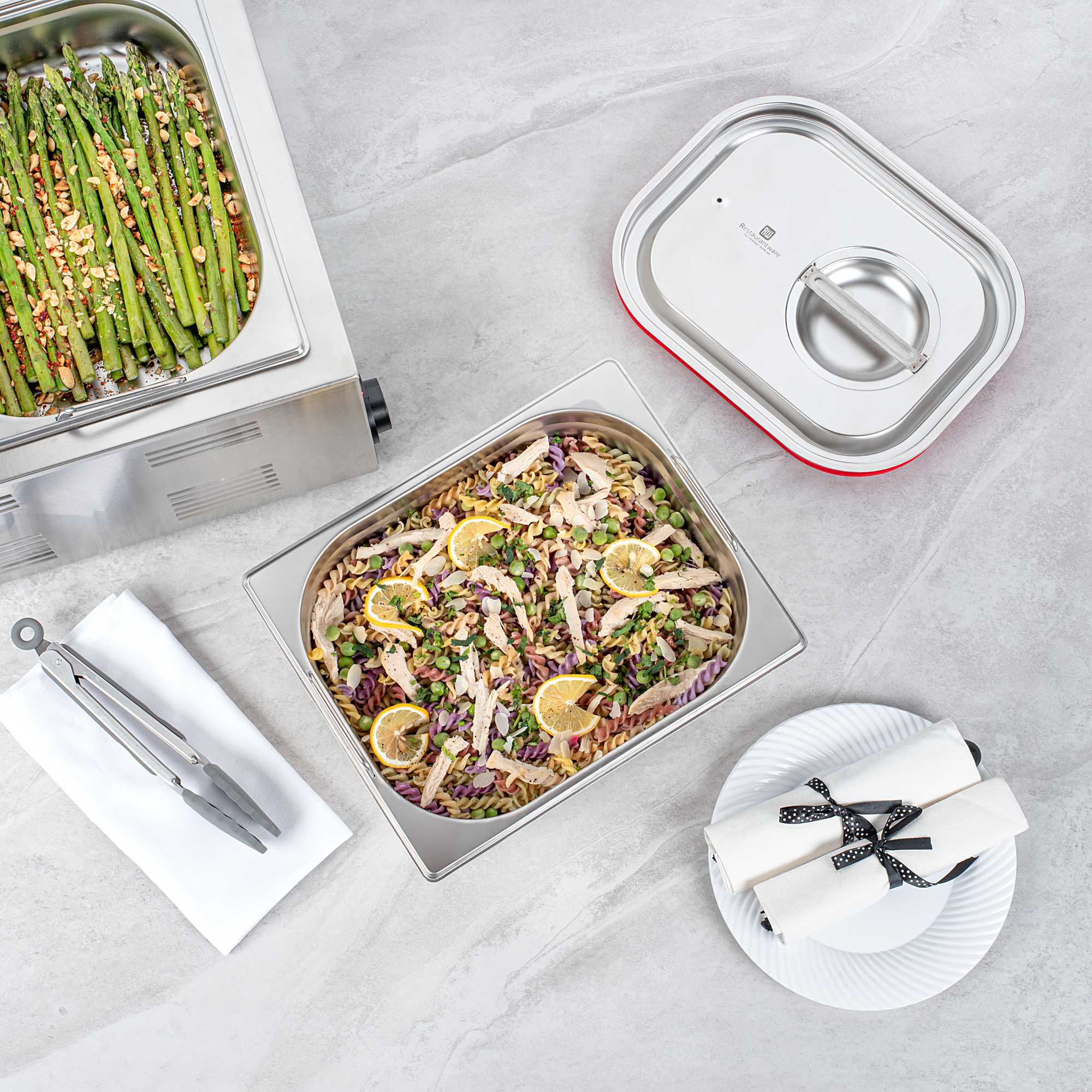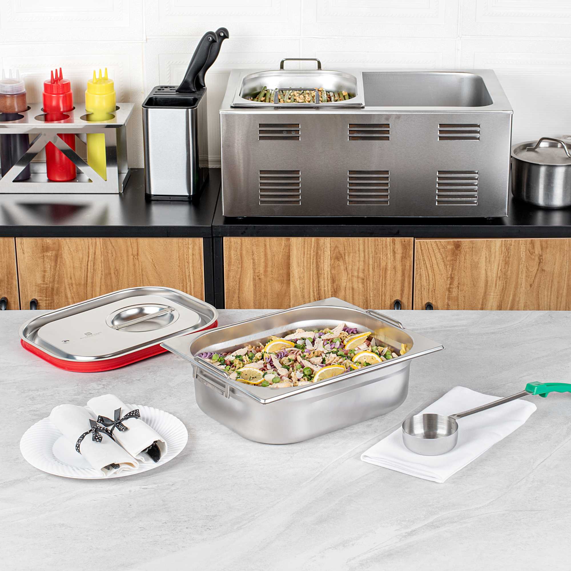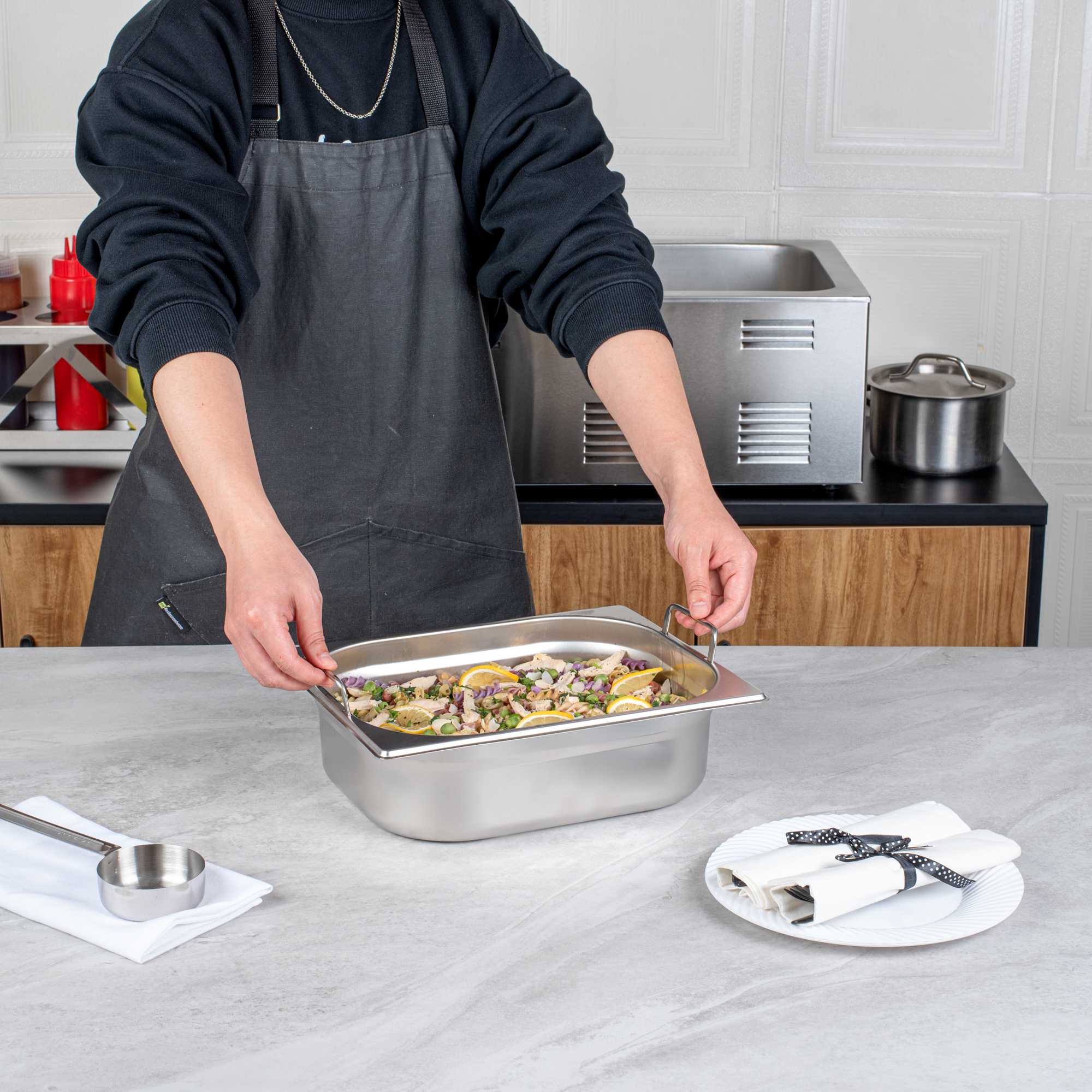 - Collapsible handles make it easy to carry and reload prepared foods in the steam table pans