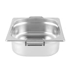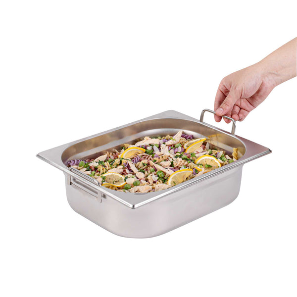 Built to be tough, durable, long-lasting, and scratch and dent resistant, these half-size stainless steel steam table pans feature a convenient anti-jamming design and smooth basin. Constructed from premium stainless steel, these pans are an ideal addition for any caterer's stainless steel cookware collection. Safely and efficiently keep prepared foods warm, and also transport food to off-site catering events and steam tables easily and efficiently. These half-size stainless steel steam table pans come with built-in collapsible handles and are constructed for conveniently moving, arranging, and carrying prepared catered dishes. Each Met Lux 1/2 Size Steam Table Pan Anti Jam Stainless Steel with Collapsible Handles measure 12.8 inches in length, 10.4 inches in width, and is 4 inches deep. One steam table pan is shipped per order.