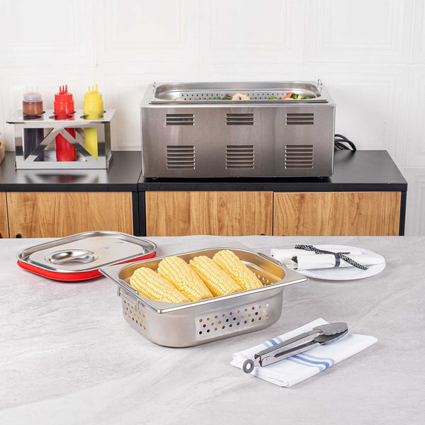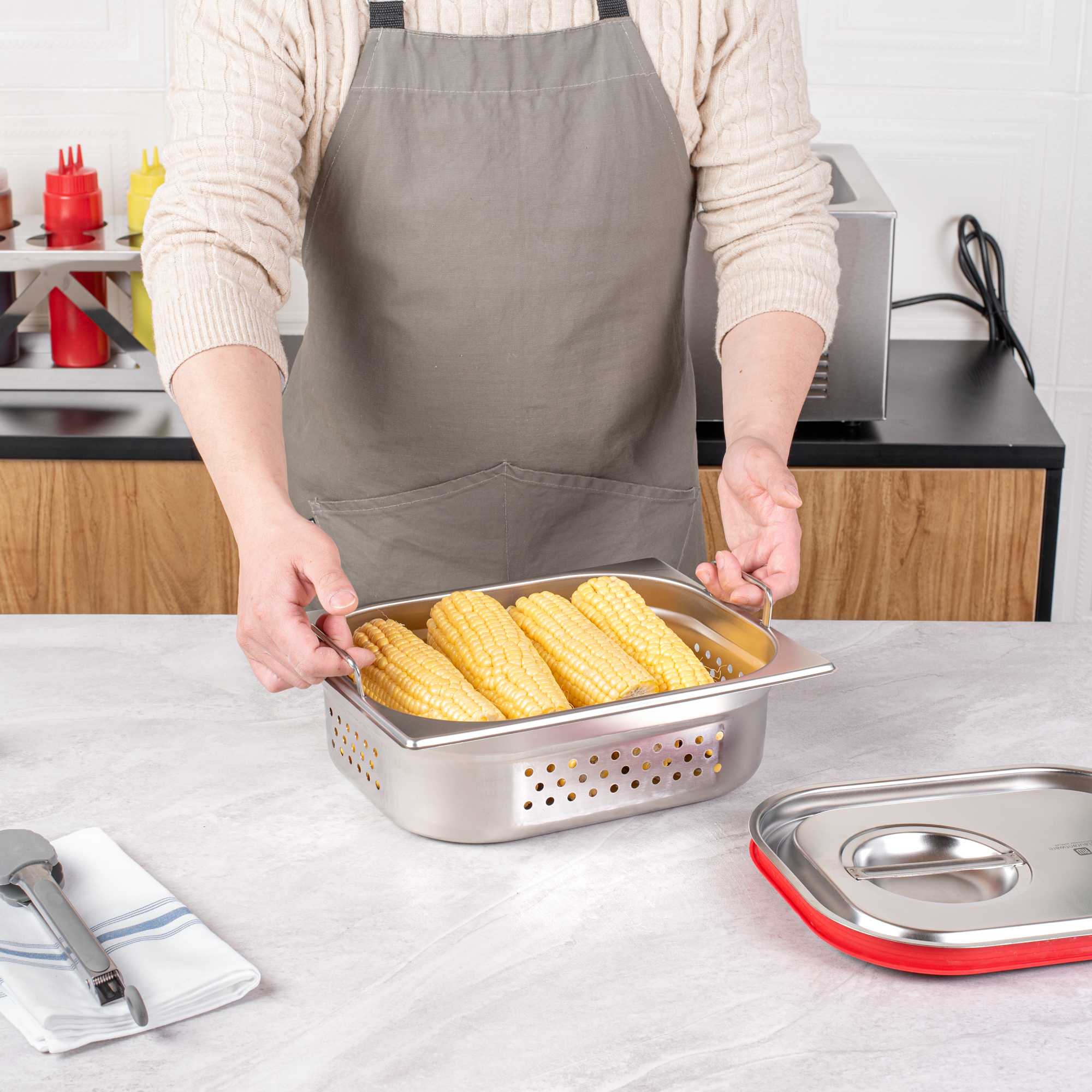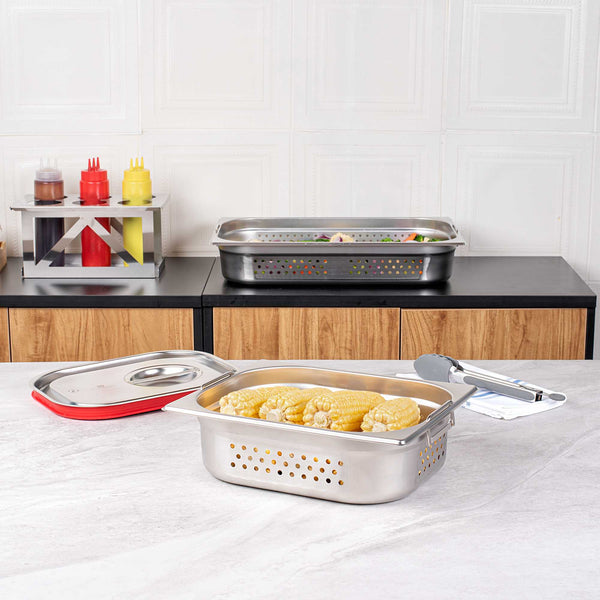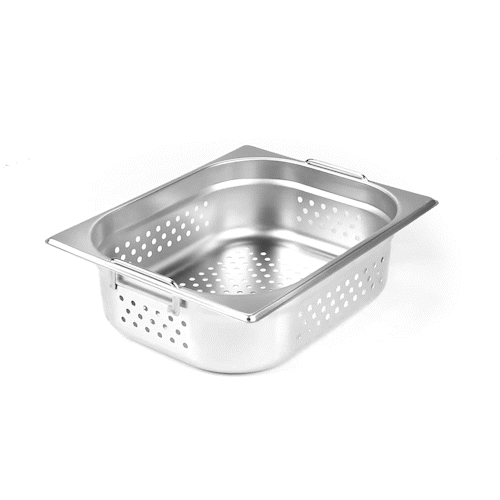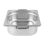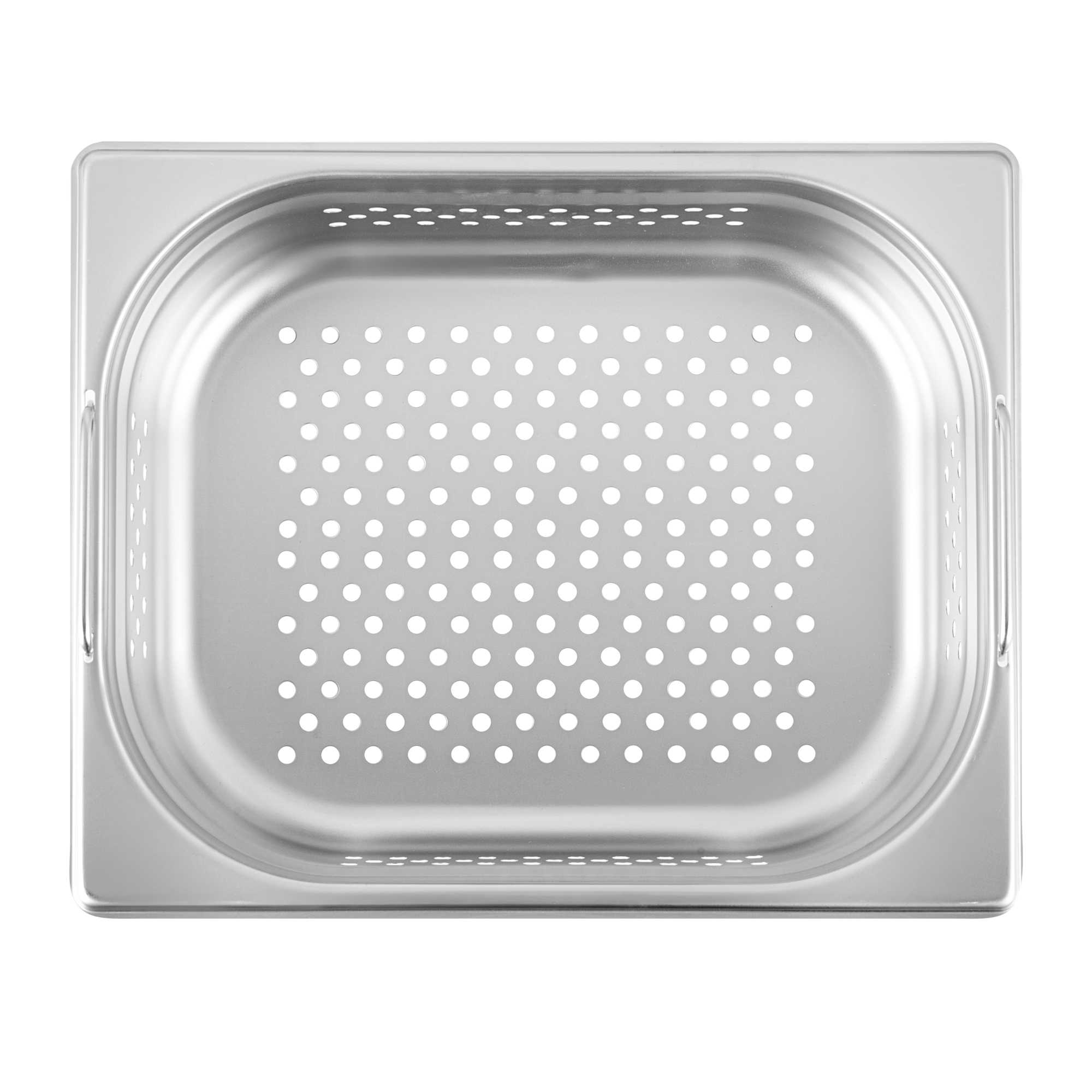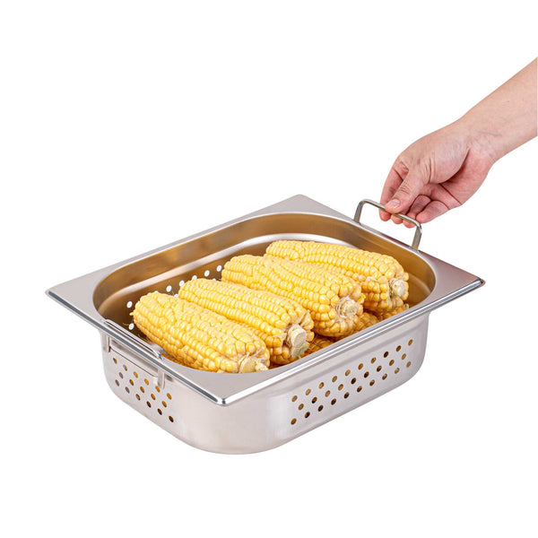Make the most of your steam table with our Met Lux 1/2 Size Anti-Jam Perforated Stainless Steel Steam Table Pans with Collapsible Handles. Equipped with innovative built-in handles, these perforated steam table pans make it easy to switch out and reload trays of your prepared food. Their flattened edges expertly lock in steam and heat, while their easy-to-grip retractable handles diminish the risk of injury and burns. Featuring an anti-jamming design, these stainless steel food pans enable quick and hassle-free storage. These impact-resistant commercial steam table pans have a depth of 4 inches and can easily contain medium to large-sized portions of pasta, steamed vegetables, prepared seafood, and more. Pair these perforated hotel pans with our spill-resistant travel lids (SKU: RWT0052) or our traditional lids (SKU: RWT0046) to complete the look. Lids sold separately. Each order will contain one 12.8-inch L x 10.4-inch W x 4-inch H perforated steam table pan with handles.