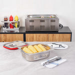 - Collapsible handles make it easy to carry and reload prepared foods in the steam table pans