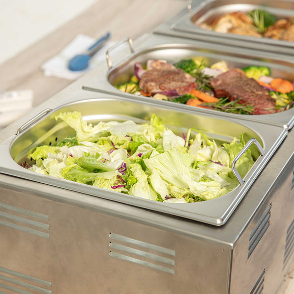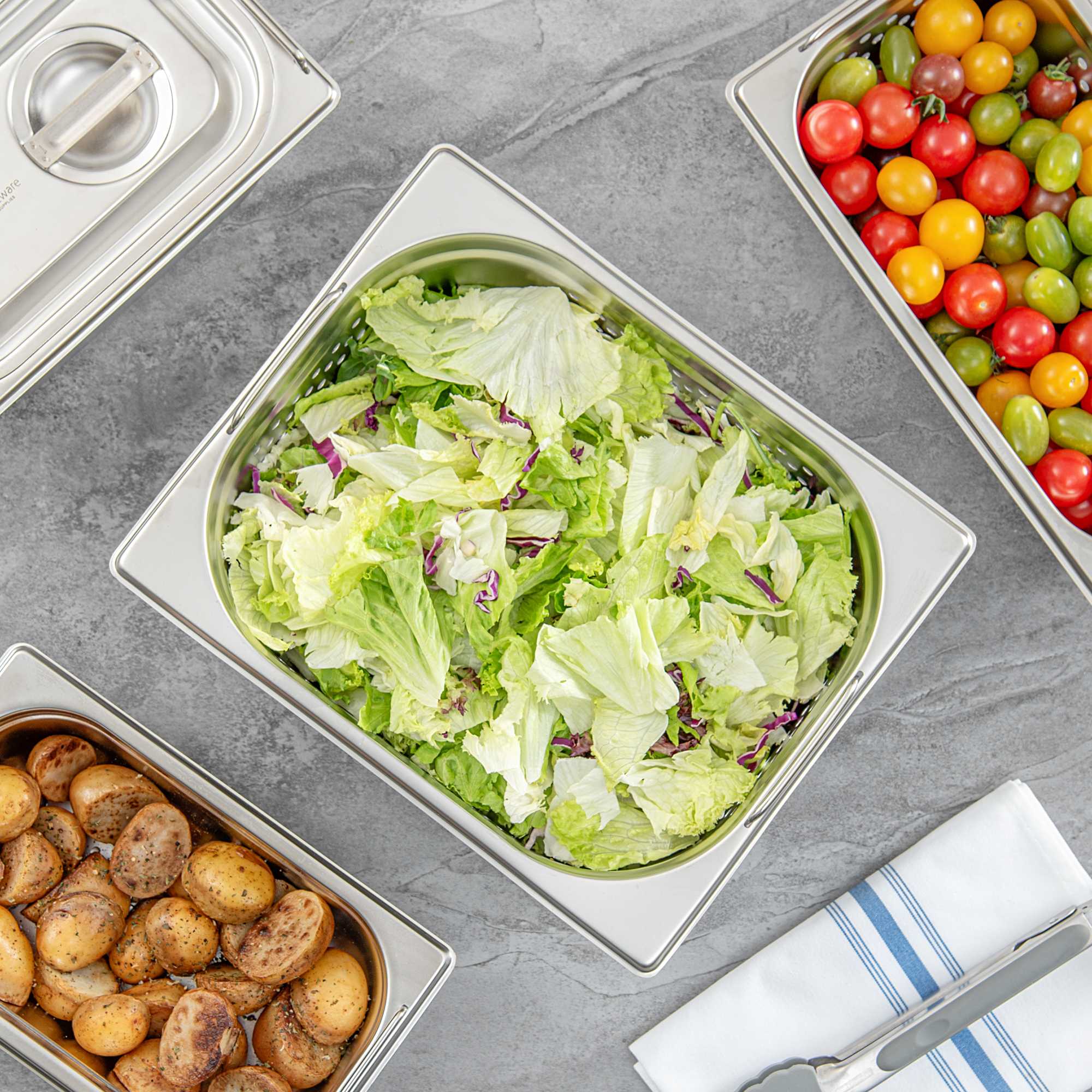 - Collapsible handles make it easy to carry and reload prepared foods in the steam table pans