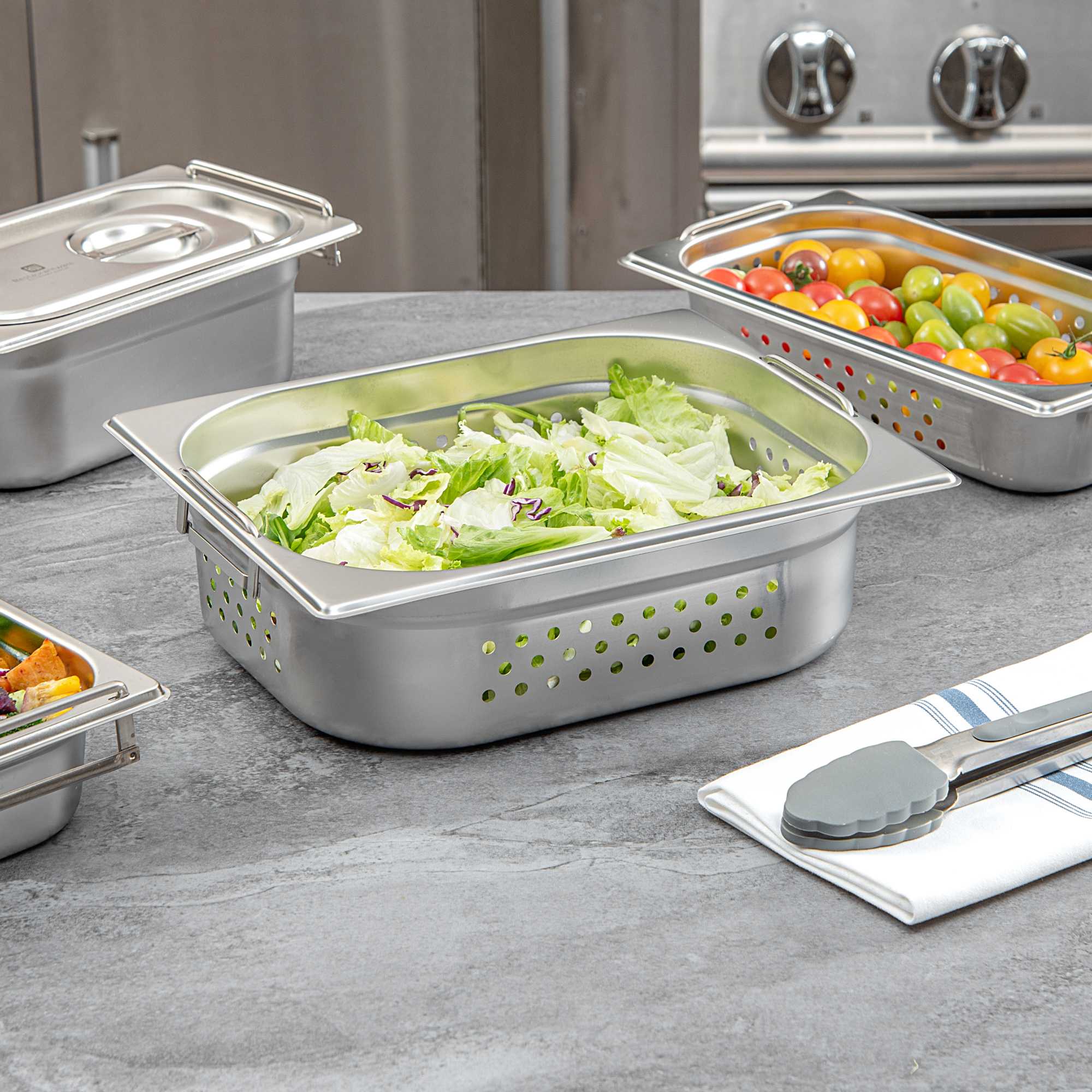 Make the most of your steam table with our Met Lux 1/2 Size Anti-Jam Perforated Stainless Steel Steam Table Pans with Collapsible Handles. Equipped with innovative built-in handles, these perforated steam table pans make it easy to switch out and reload trays of your prepared food. Their flattened edges expertly lock in steam and heat, while their easy-to-grip retractable handles diminish the risk of injury and burns. Featuring an anti-jamming design, these stainless steel food pans enable quick and hassle-free storage. These impact-resistant commercial steam table pans have a depth of 4 inches and can easily contain medium to large-sized portions of pasta, steamed vegetables, prepared seafood, and more. Pair these perforated hotel pans with our spill-resistant travel lids (SKU: RWT0052) or our traditional lids (SKU: RWT0046) to complete the look. Lids sold separately. Each order will contain one 12.8-inch L x 10.4-inch W x 4-inch H perforated steam table pan with handles.