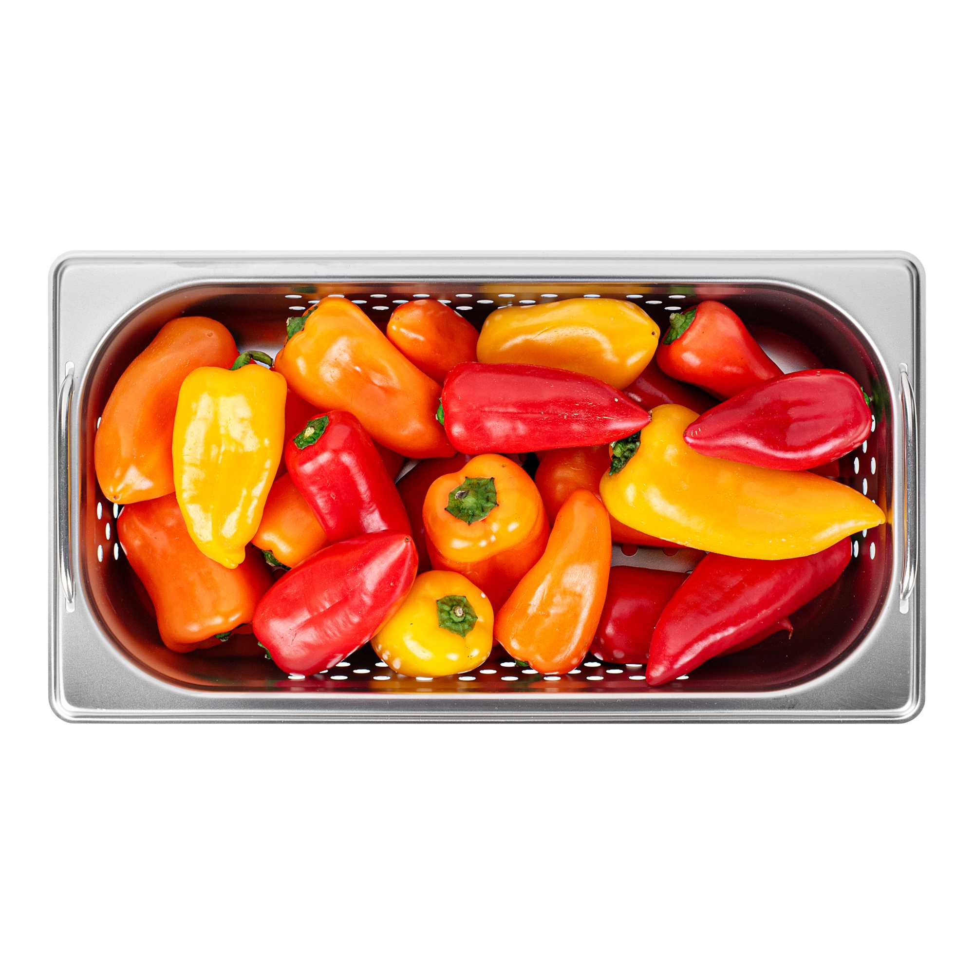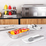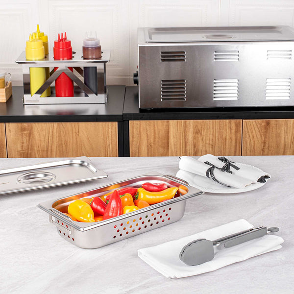 Boost efficiency and streamline serving with our Met Lux 1/3 Size Anti-Jam Perforated Stainless Steel Steam Table Pans with Collapsible Handles. Designed with easy-to-grip retractable handles, these perforated hotel pans make it effortless to transport, steam, and drain trays of your prepared foods. Their reinforced corners expertly resist warping or cracking, while their impact-resistant stainless steel body ensures reliable and long-term commercial use. These buffet steam table pans are also equipped with an innovative anti-jamming design to prevent pans from sticking together and enable hassle-free storage. These 1/3 steam table pans measure 2.5 inches in depth and can contain medium-sized portions of steamed vegetables, cooked pasta, poached seafood, and more. Pair these perforated hotel pans with our spill-resistant travel lids (SKU: RWT0053) or our traditional stainless steel lids (SKU: RWT0047) to complete the look. Lids sold separately. Each order will contain one 12.8-inch L x 7-inch W x 2.5-inch H perforated steam table pan with handles.