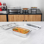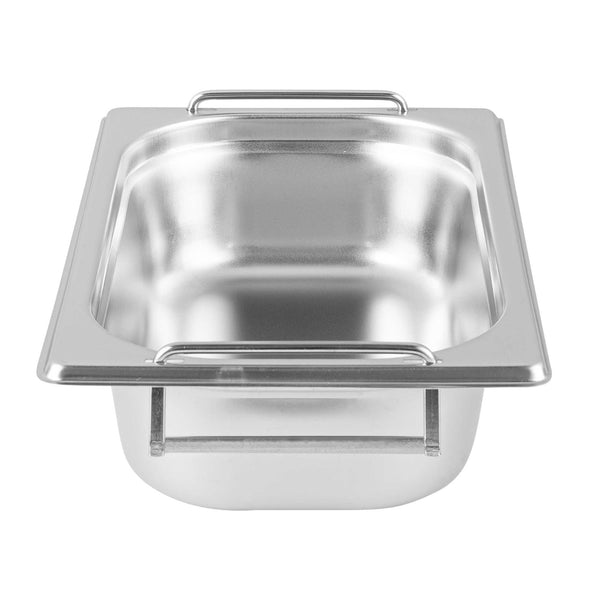 Complete your steam table set up with our Met Lux 1/4 Size Anti-Jam Stainless Steel Steam Table Pans with Collapsible Handles. Equipped with easily collapsible handles, these buffet steam table pans make it effortless to load and unload your prepared foods. Their reinforced corners are built to resist warping or cracking, while their anti-jam design prevents pans from sticking together for easy and hassle-free storage. Constructed with raised rims and flattened edges to lock in steam and heat, these commercial steam table pans are ideal for use during buffet services and catered events. Their stainless steel construction is conveniently freezer and oven-safe, while their impact-resistant design enables long-term commercial use. Each of these fourth restaurant steam table pans measures 2.5 inches deep and can be used to contain smaller portions of appetizers, entrees, desserts, and more. Pair these steam table pans with our spill-resistant travel lids (SKU: RWT0054) or our traditional stainless steel lids (SKU: RWT0048) to complete the look! Lids sold separately. Each order will contain one 10.4-inch L x 6.4-inch x 2.5-inch H hotel pan with handles.
