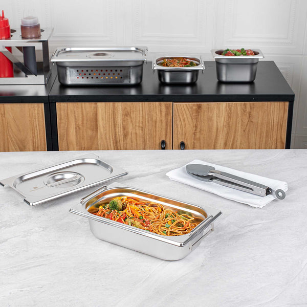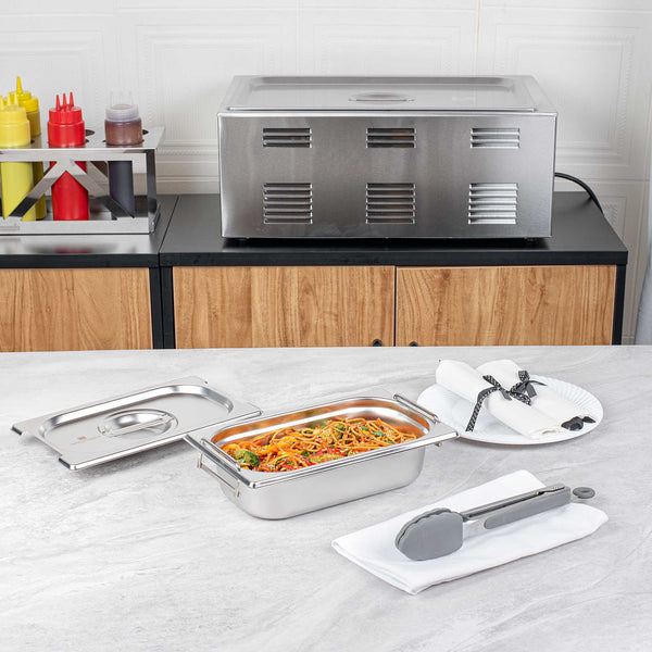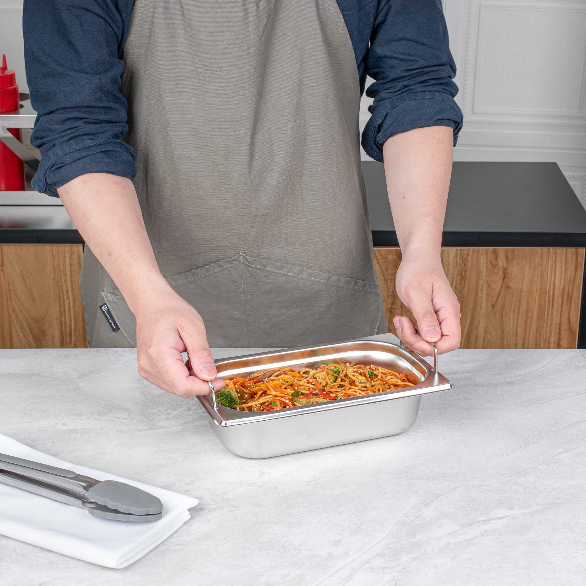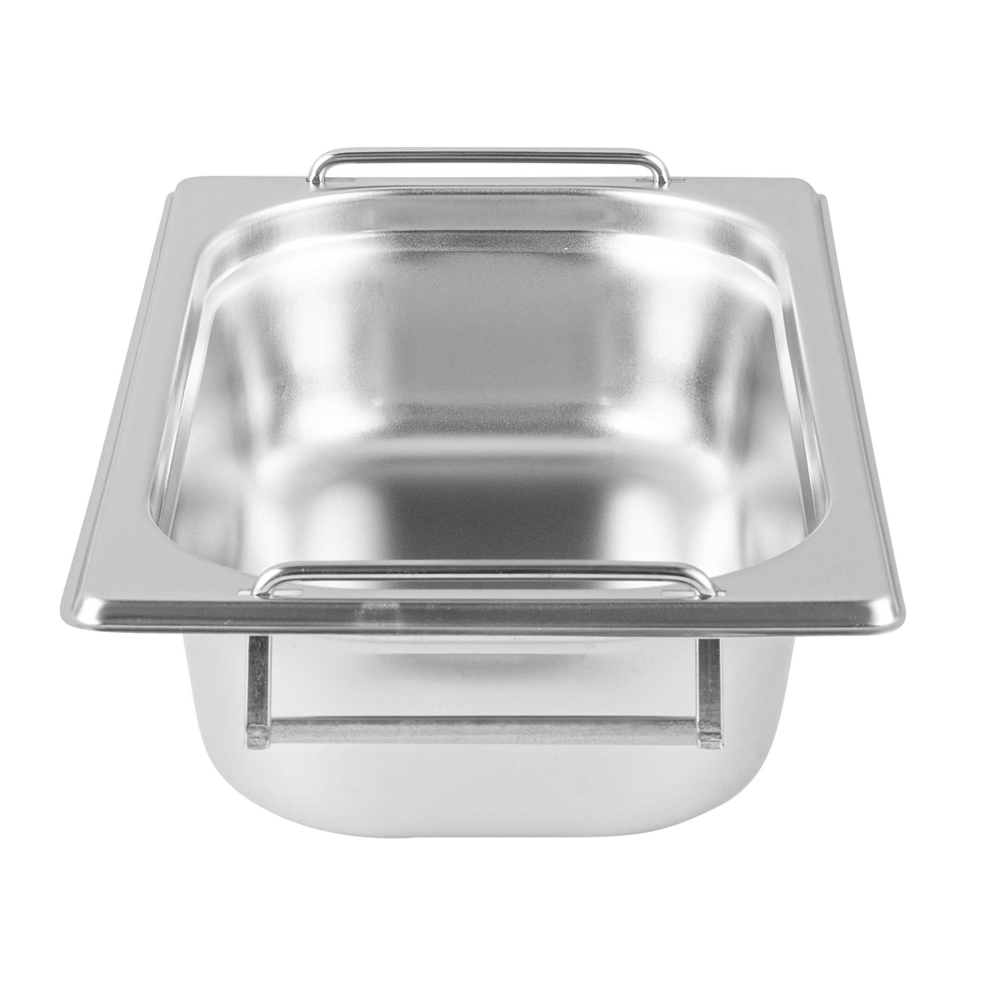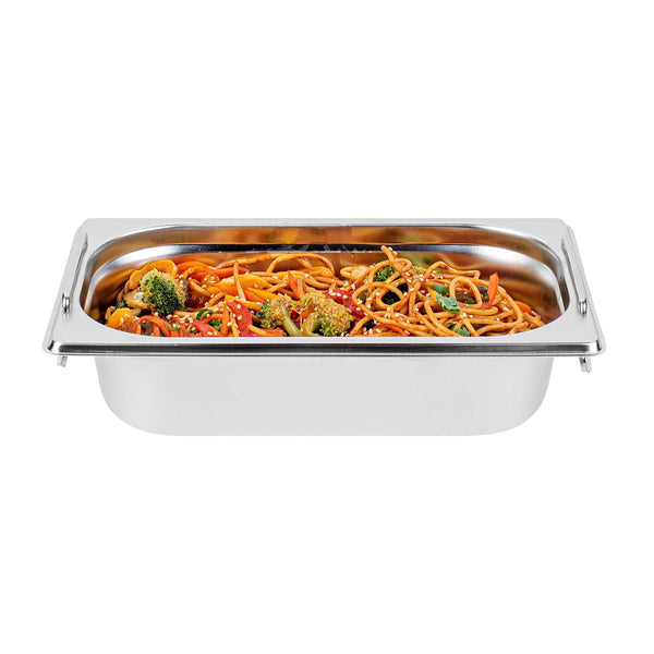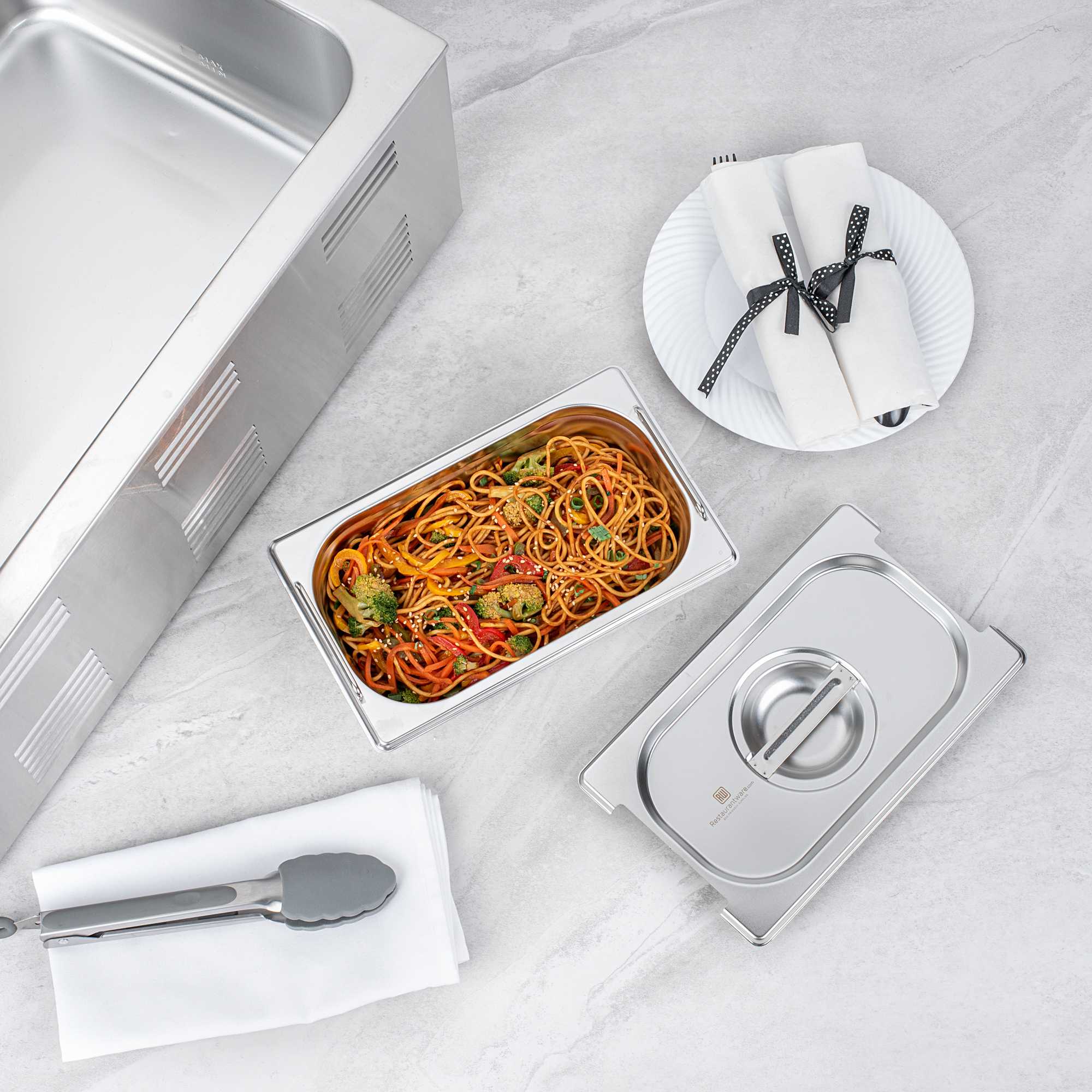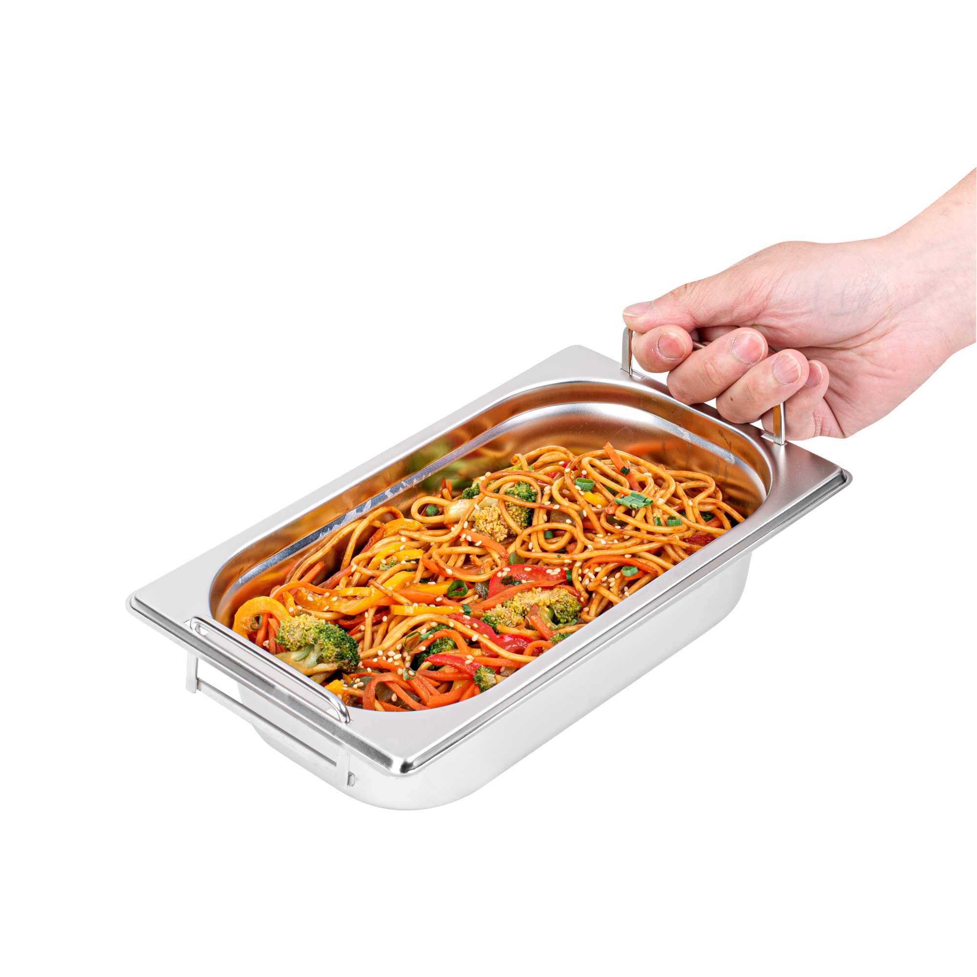 - Collapsible handles make it easy to carry and reload prepared foods in the steam table pans