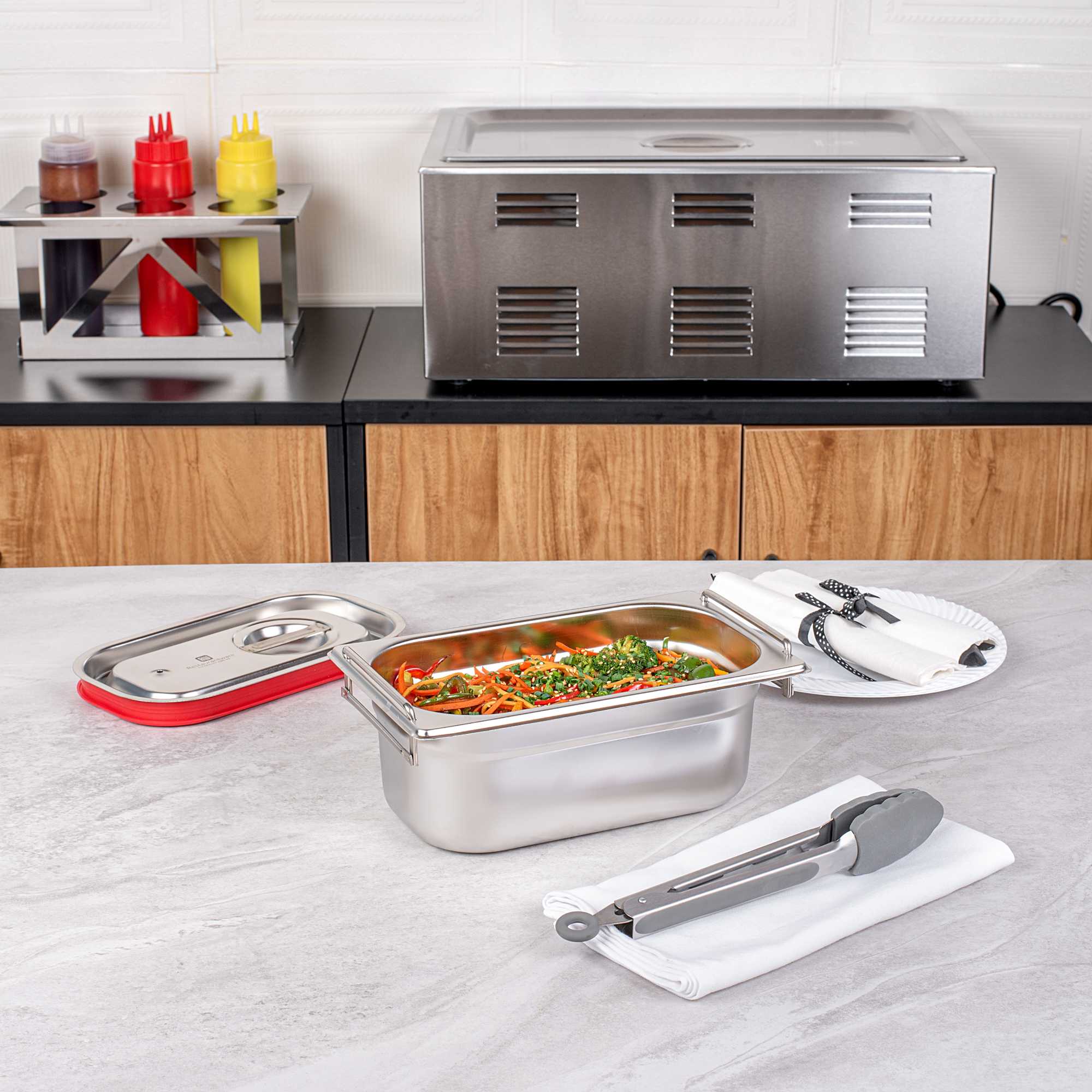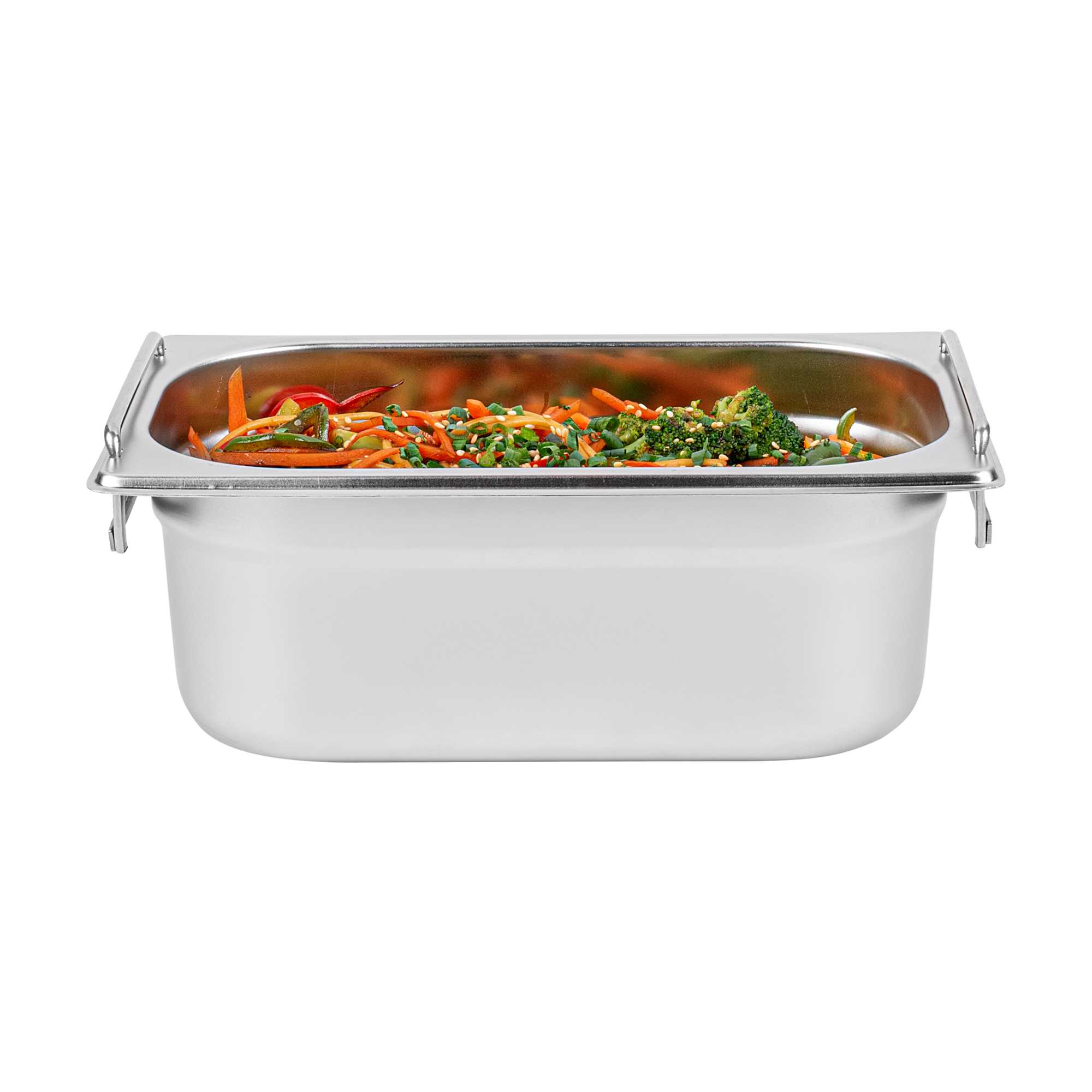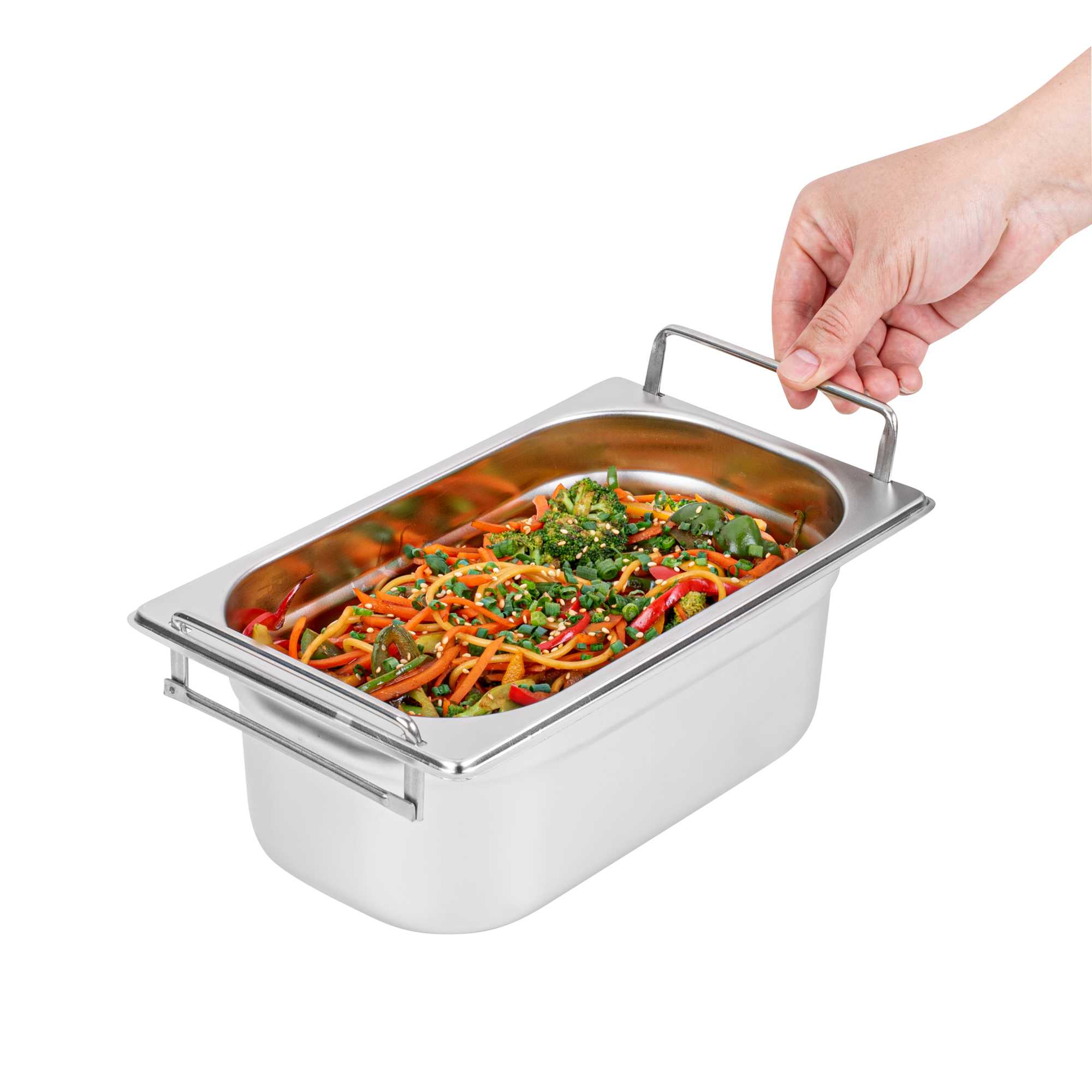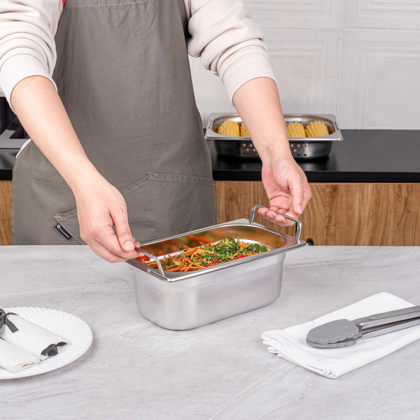- Collapsible handles make it easy to carry and reload prepared foods in the steam table pans
