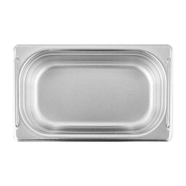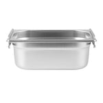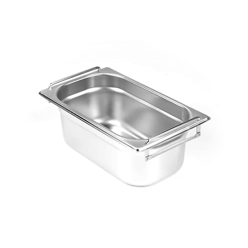 Upgrade your catered events and buffet service with our Met Lux 1/4 Size Anti-Jam Stainless Steel Steam Table Pans with Collapsible Handles. Designed with built-in retractable handles, these stainless steel food pans make it easy to transport and switch out your prepared foods. Their raised rim and flattened edges lock in steam and heat, while their easy-to-grip collapsible handles lessen the risk of burns and injury. Constructed from high-quality stainless steel, these impact-resistant steam table trays are built to withstand long-term commercial use. Their innovative anti-jam design prevents pans from sticking together and enables quick and hassle-free storage. Mix and match our available steam table pan sizes to create a customized solution for your establishment! Each of these oven-safe hotel pans measures 4 inches deep and can contain small to medium-sized portions of your delicious dishes. Pair these steam table pans with our spill-resistant travel lids (SKU: RWT0054) or our traditional stainless steel lids (SKU: RWT0048) to complete the look! Lids sold separately. Each order will contain one 10.4-inch L x 6.4-inch W x 4-inch H hotel pan with handles.