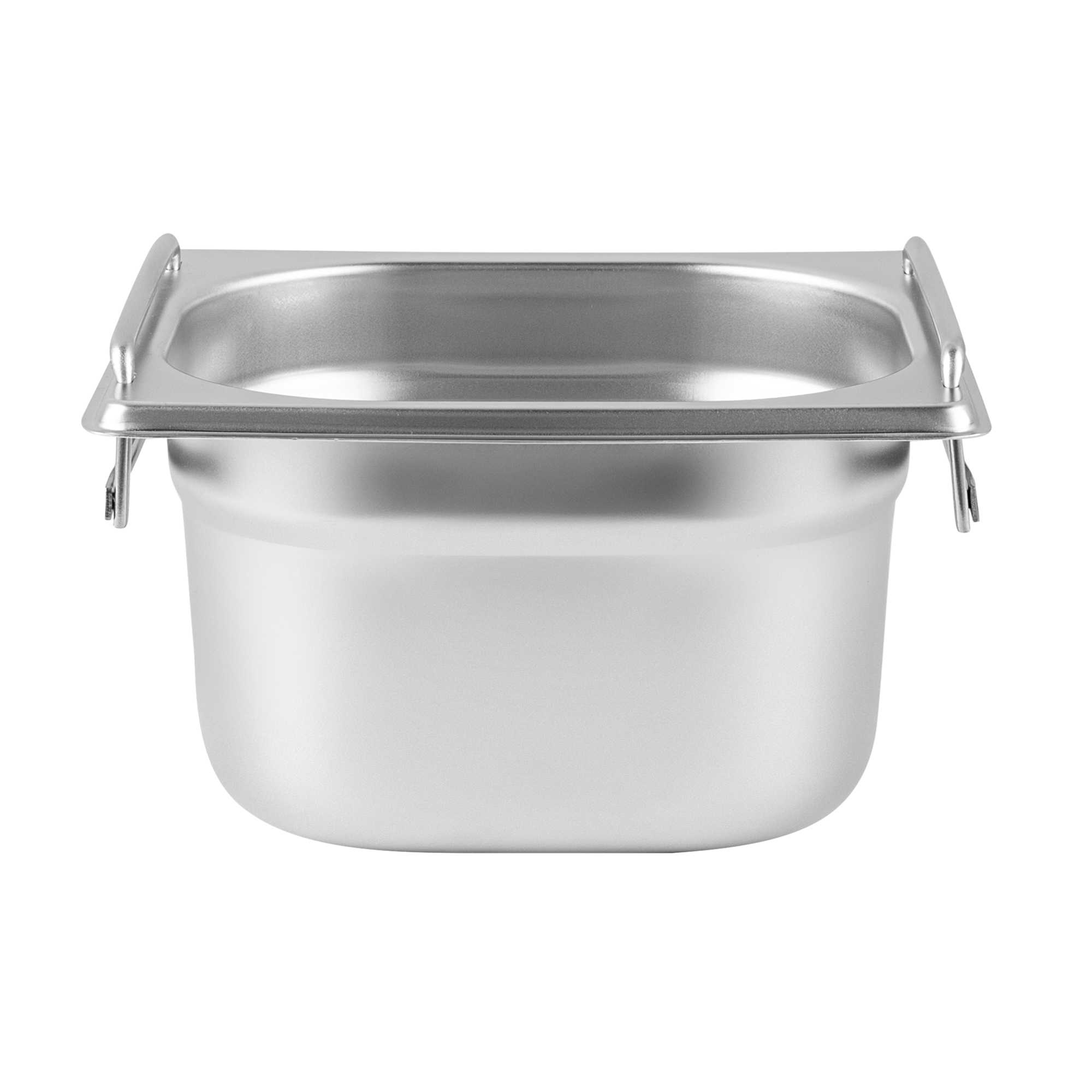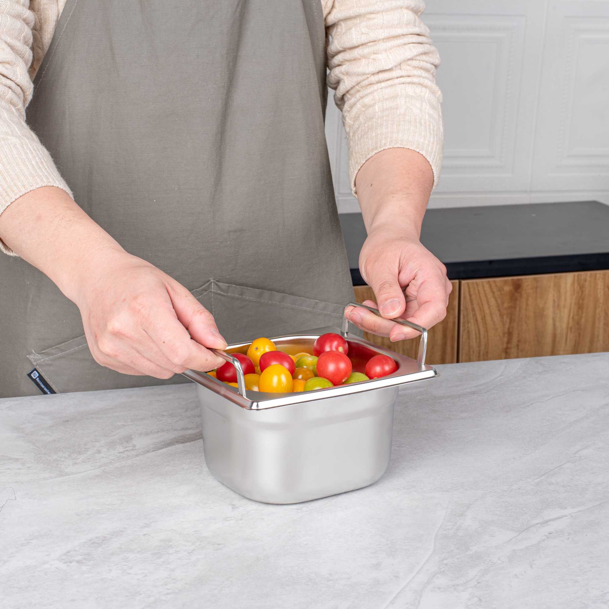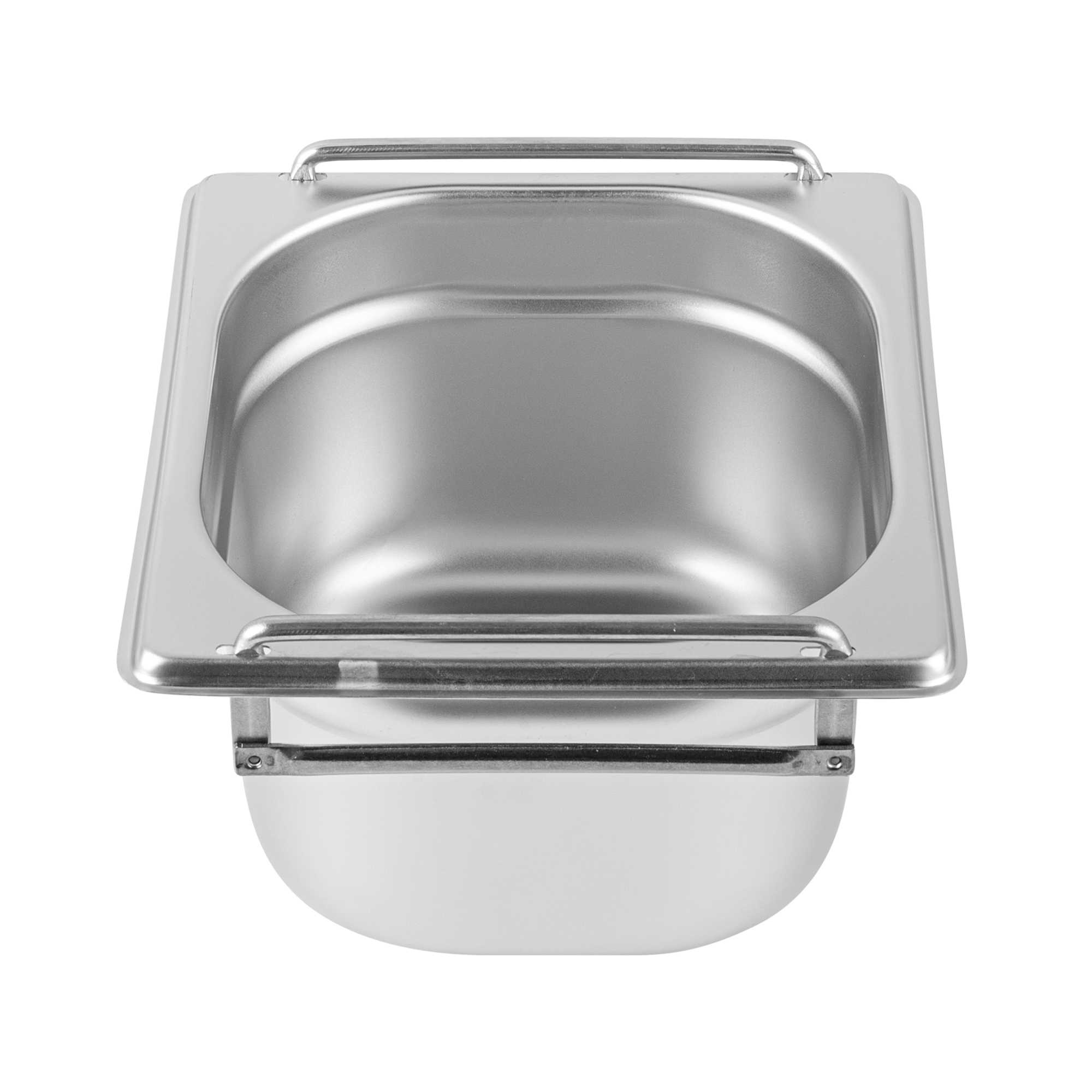 Boost the efficiency of your buffet steam table with our Met Lux 1/6 Size Anti-Jam Stainless Steel Steam Table Pan with Collapsible Handles. Built with easy-to-grip retractable handles, these stainless steel restaurant pans make it effortless to transport and load your prepared foods. Their reinforced corners are designed to expertly resist warping or breakage, while their impact-resistant stainless steel construction ensures long-term commercial use. These 6th pans are also equipped with an anti-jam design that prevents pans from sticking together for quick and hassle-free storage. Each of these hotel pans with handles measures 4 inches deep and can be used to contain small portions of appetizers, sauces, soups, desserts, and more. Combine these steam table pans with our spill-resistant travel lids (SKU: RWT0055) or our traditional stainless steel lids (SKU: RWT0049) to complete the look. Lids sold separately. Each order will contain one 7-inch L x 6.4-inch W x 4-inch H steam table pan with handles.