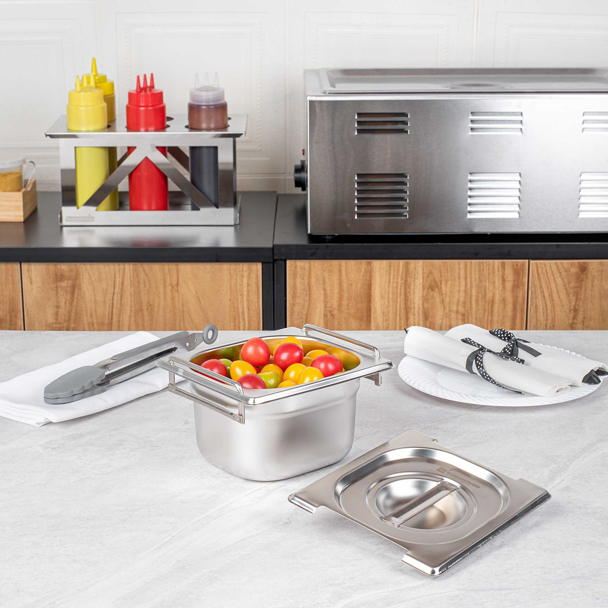 - Collapsible handles make it easy to carry and reload prepared foods in the steam table pans