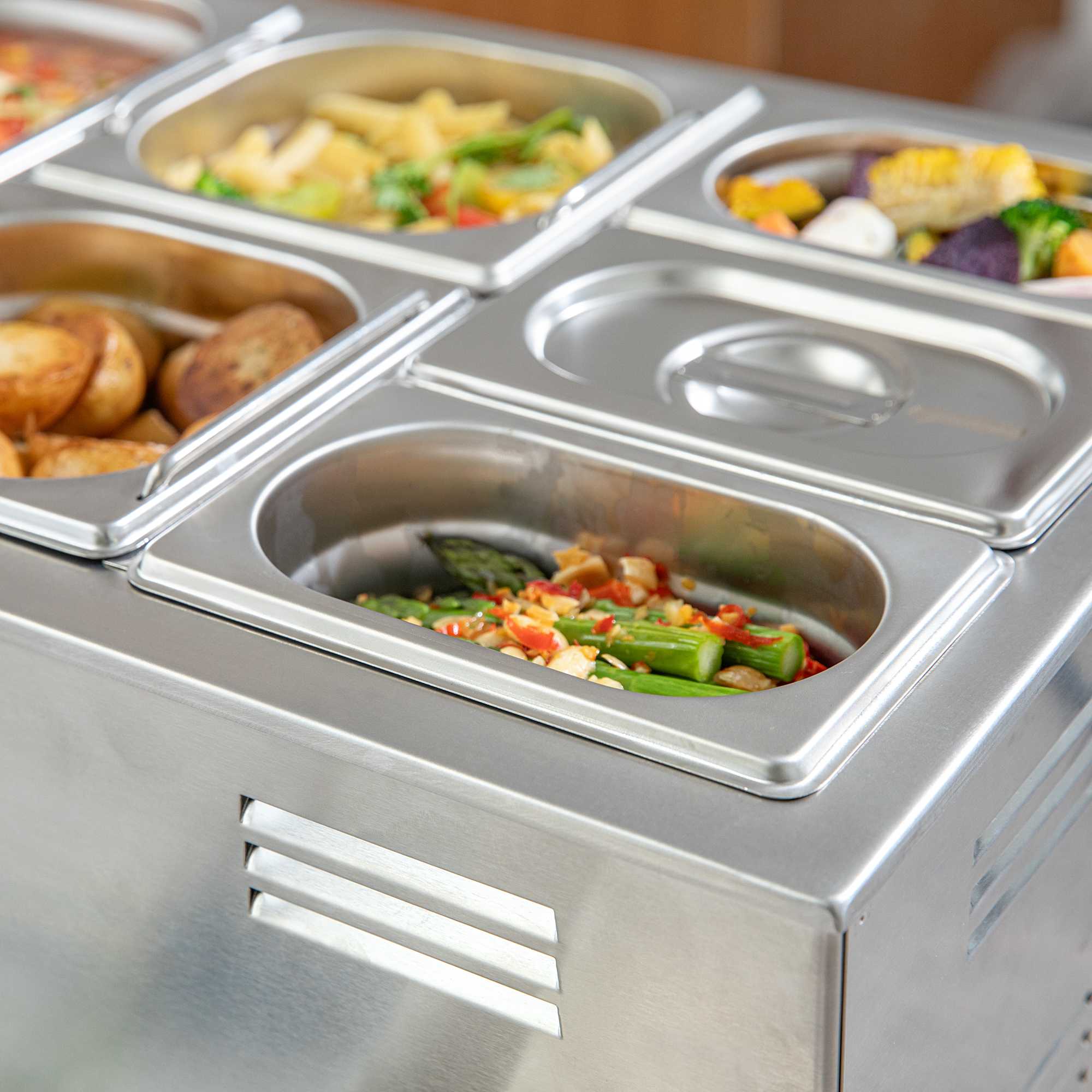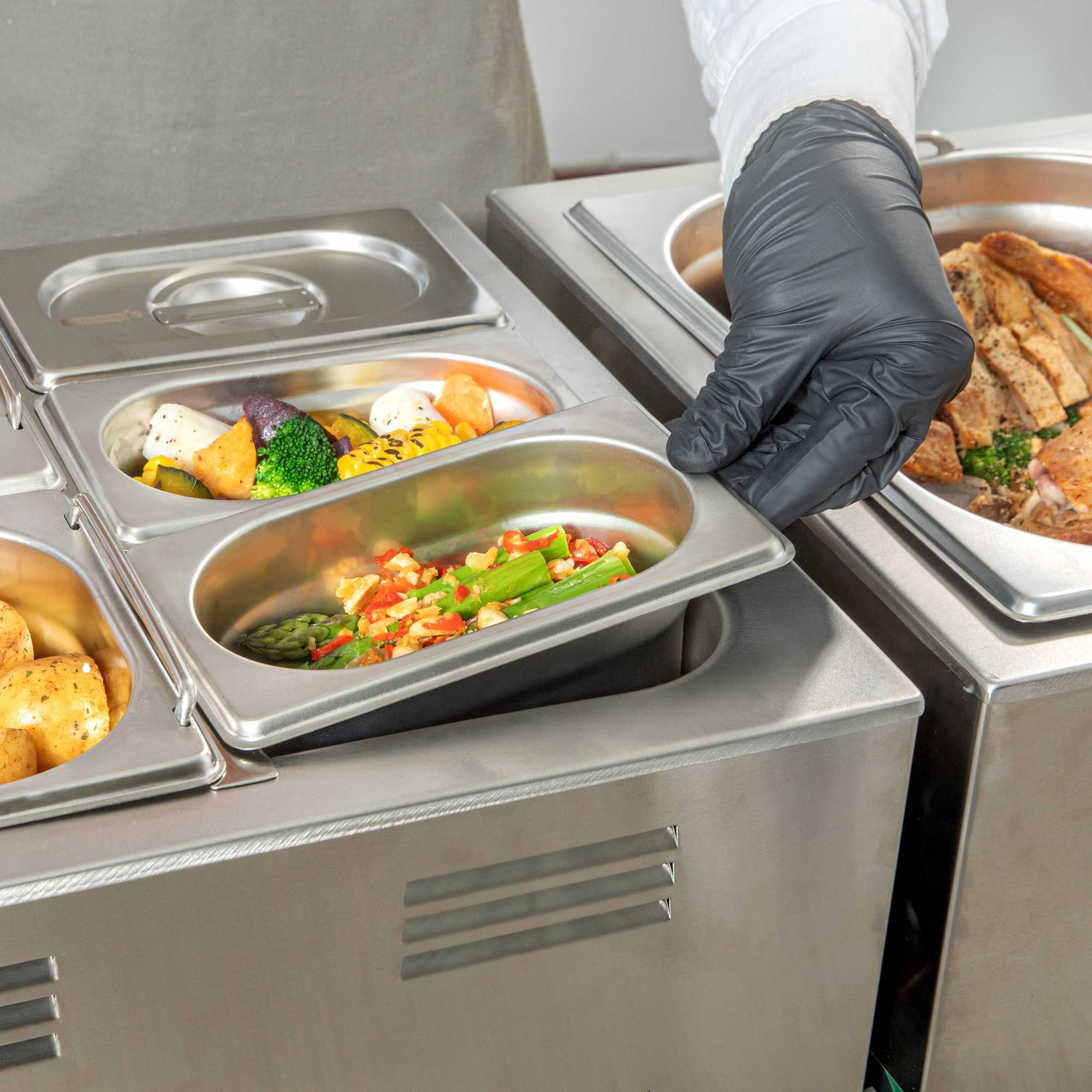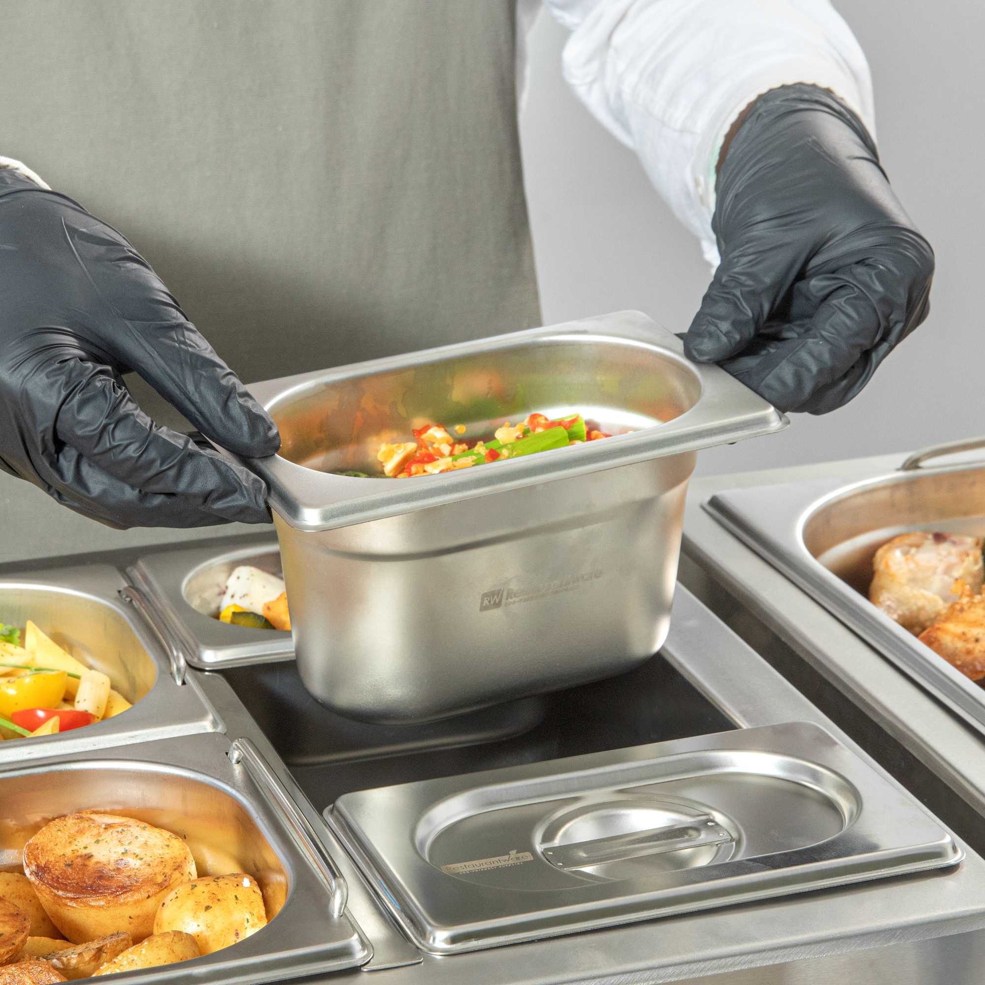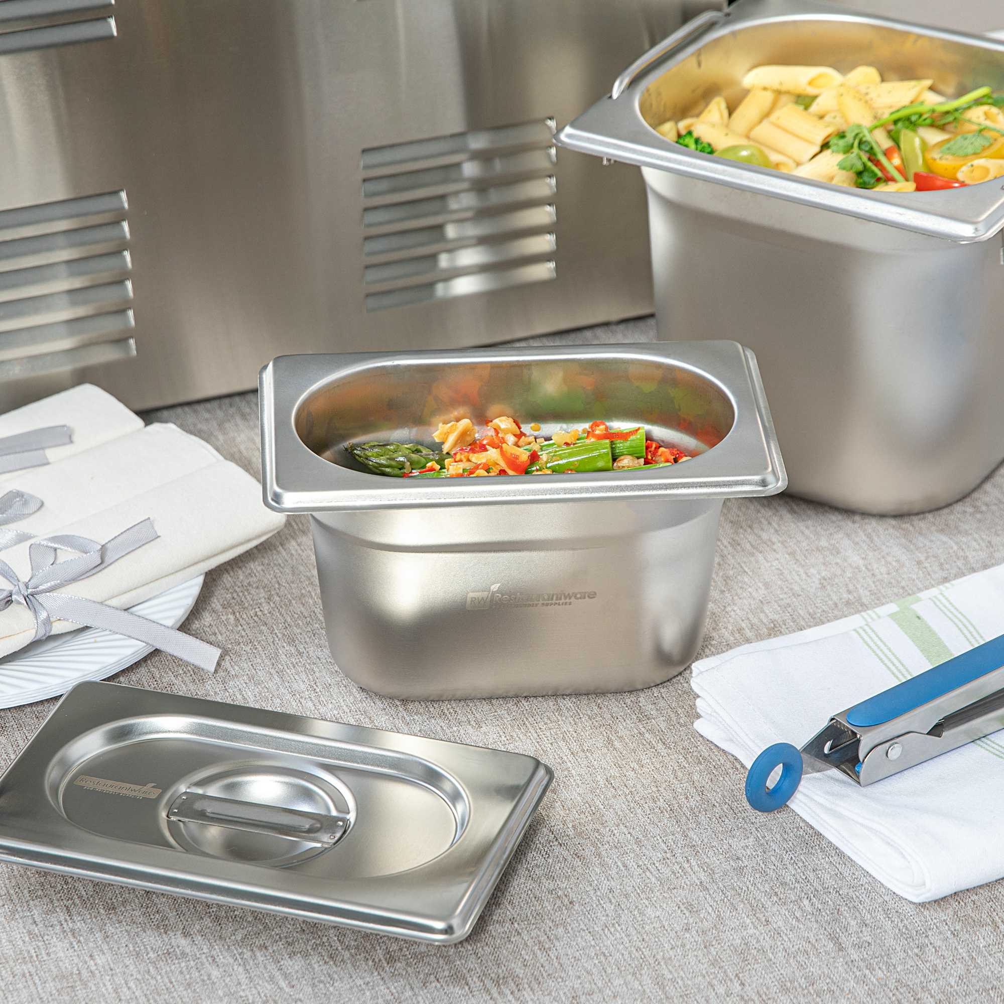 Improve your food prep and catered events with our Met Lux 1/9 Size Anti-Jam Stainless Steel Steam Table Pans. Constructed from high-quality stainless steel, these 1/9 hotel pans can be safely used with both hot and cold foods. Their reinforced corners are designed to resist cracking and warping, while their anti-jamming design enables easy stacking and hassle-free storage. With a depth of 4 inches, these hotel pans are ideal for holding or warming prepared ingredients, sauces, or glazes on restaurant steam tables or prep areas. Pair these commercial-use stainless steel hotel pans with lids (SKU: RWT0050) and our selection of various hotel pan sizes to complete the look! Lids sold separately. Each order will contain one 7-inch L x 4.3-inch W x 4-inch H hotel pan.
