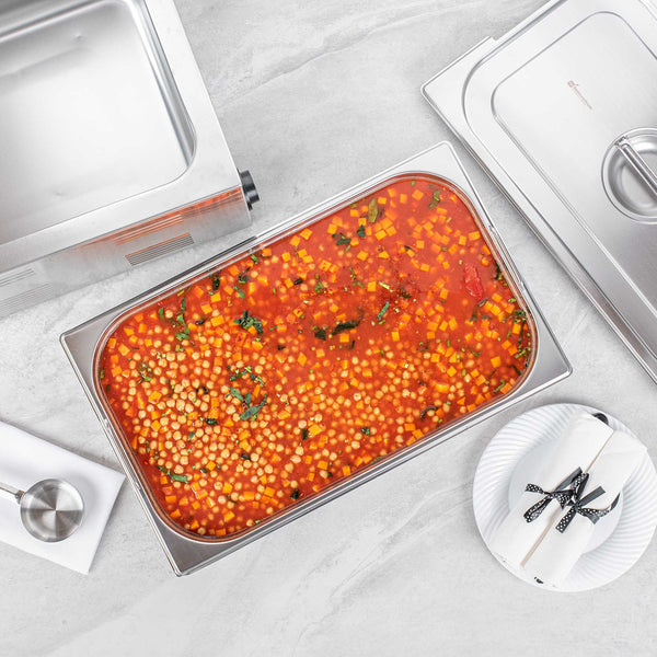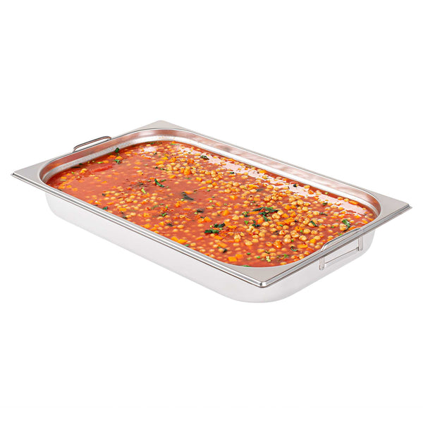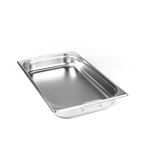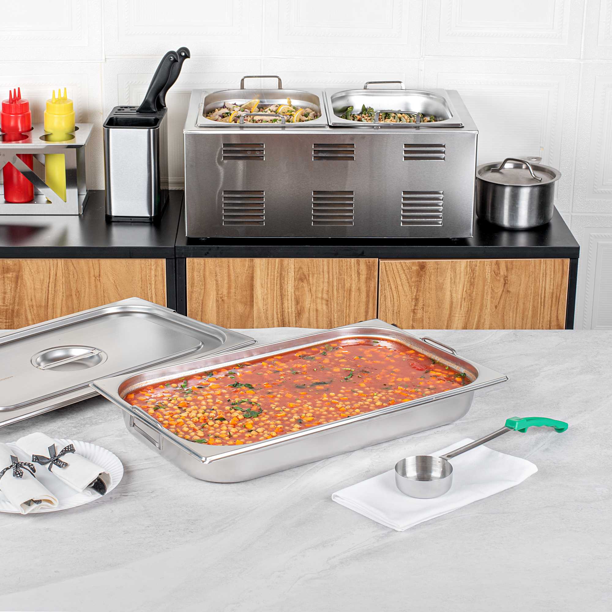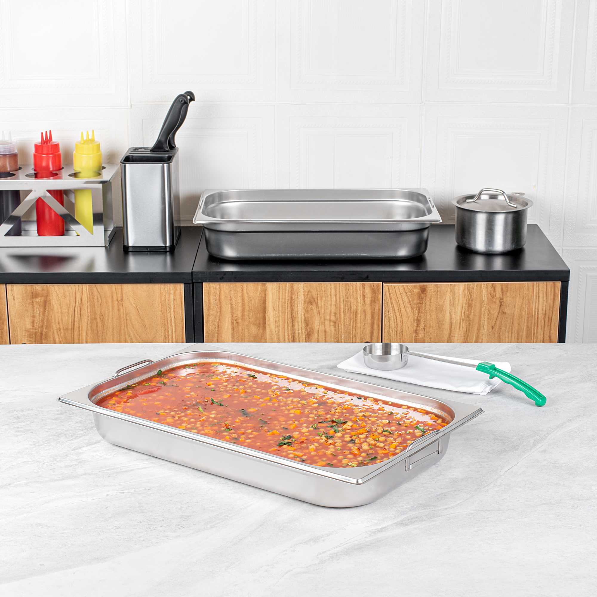 Make the most of your steam table pans with our Met Lux Full Size Anti-Jam Stainless Steel Steam Table Pans with Collapsible Handles. Designed with innovative built-in handles, these full size steam pans make transporting and reloading your prepared foods a breeze. Their flattened borders expertly lock in steam and heat to keep your food enjoyably warm, while their easy-to-grip retractable handles work to reduce the risk of burns or injury. Intended for long-term commercial use, these impact-resistant stainless steel steam pans are conveniently freezer and oven-safe. These steam table pans feature reinforced corners and an anti-jam design that prevents pans from sticking together for quick and hassle-free storage. Measuring 2.5 inches deep, these full-size hotel pans are perfect for holding large portions of food at restaurants, corporate functions, hotel buffet services, and catered events. Pair these steam table pans with lids, like our spill-resistant travel lids (SKU: RWT0051) or traditional stainless steel pan lids (SKU: RWT0045), to complete the look! Lids sold separately. Each order will contain one 20.8-inch L x 12.8-inch W x 2.5-inch H steam table pan.