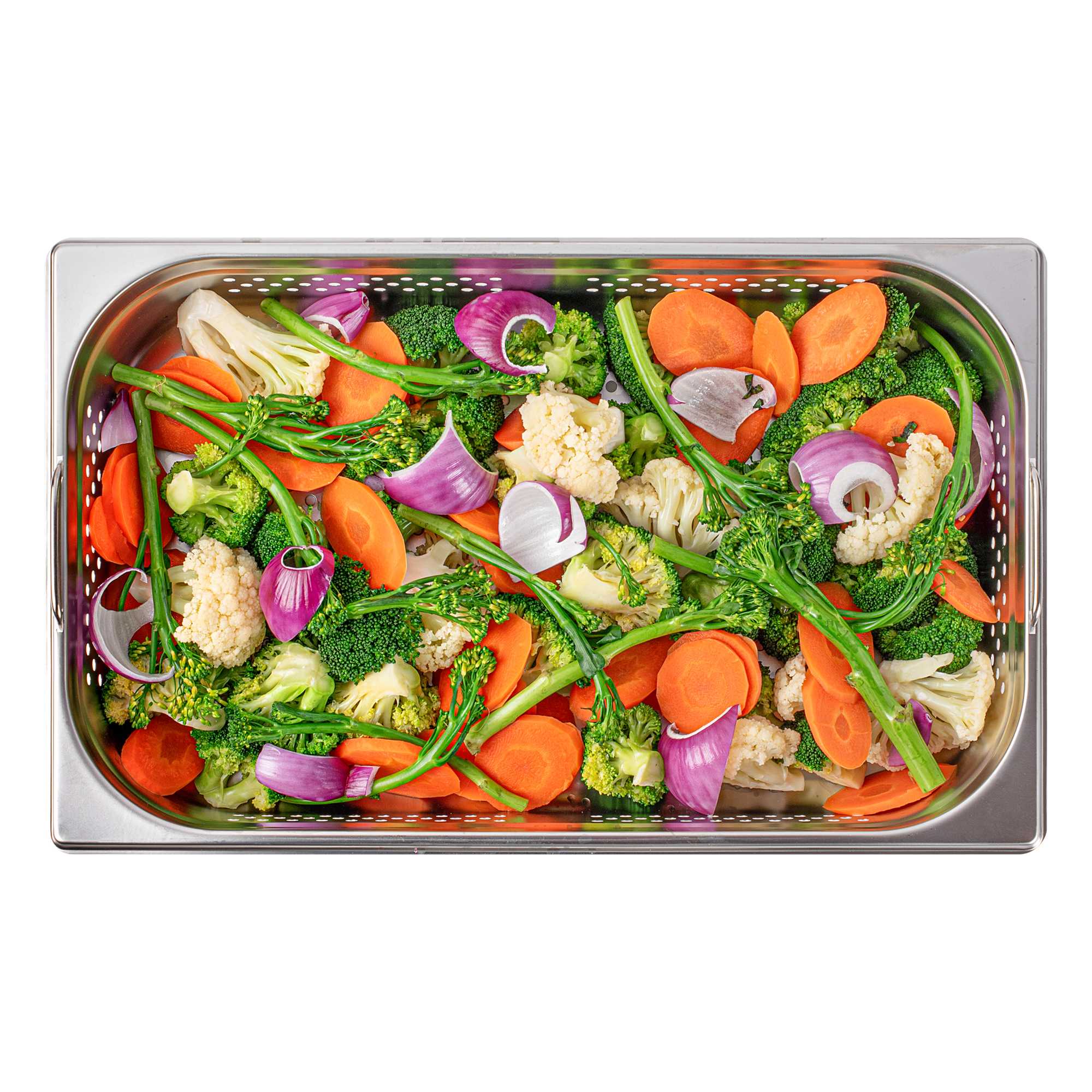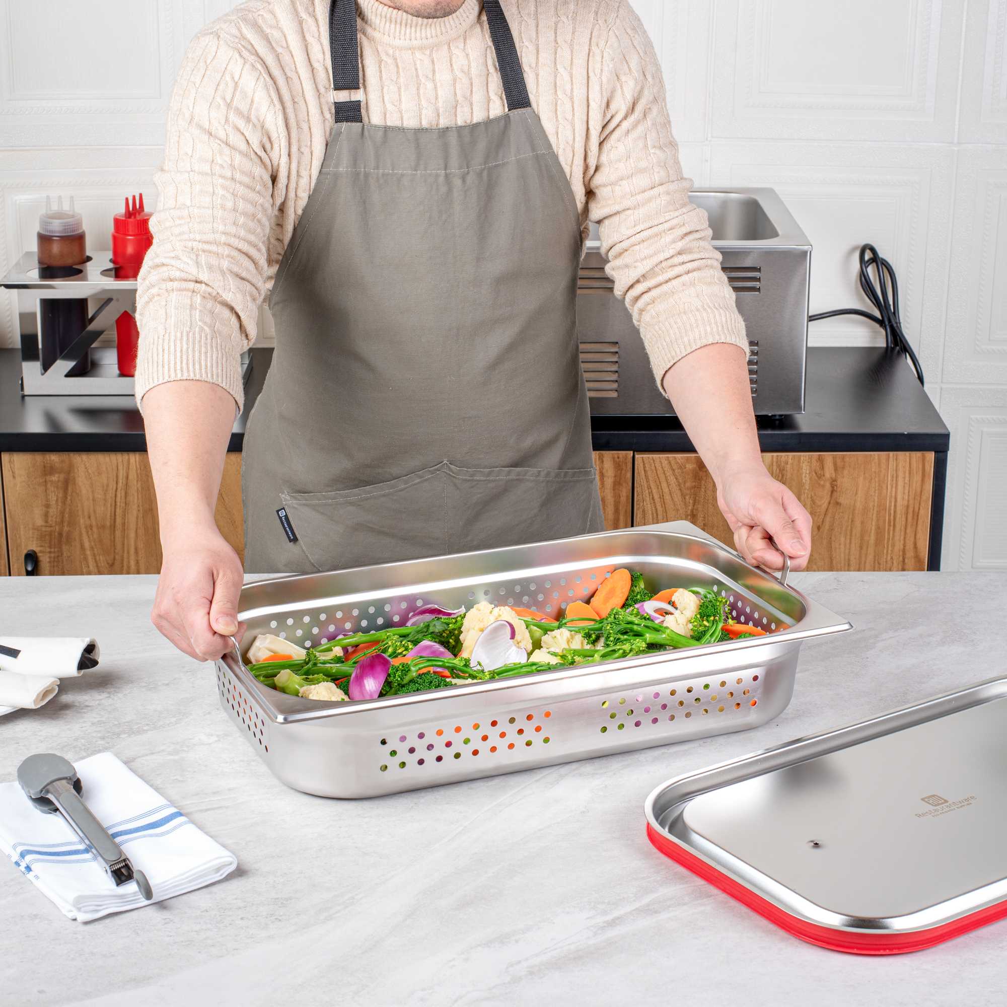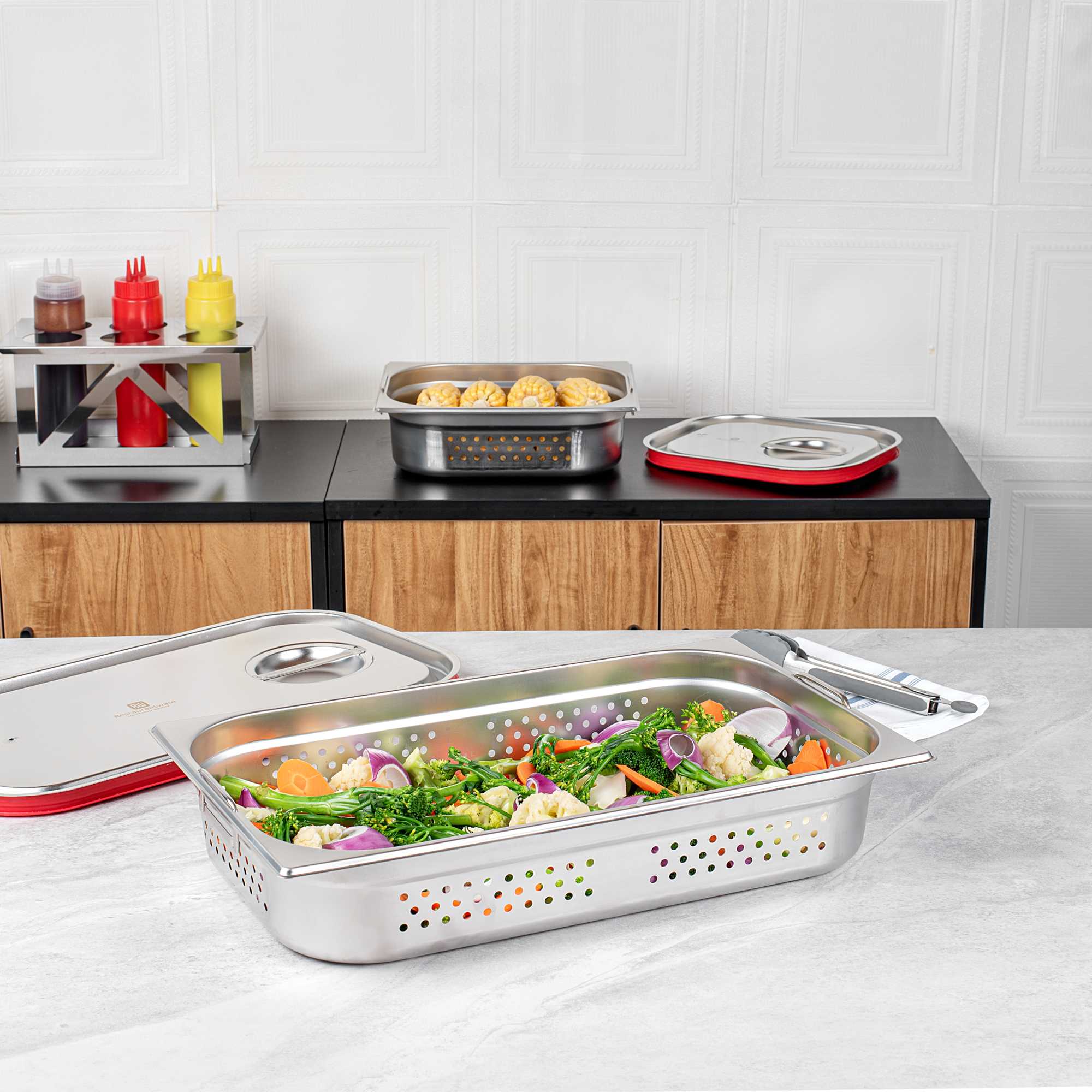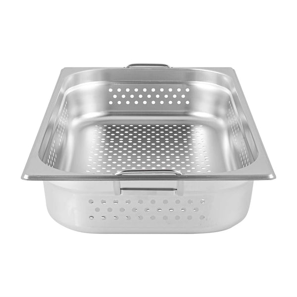 Instantly improve your buffet service and catered events with our Met Lux Full Size Anti-Jam Perforated Stainless Steel Steam Table Pans with Collapsible Handles. Equipped with built-in handles, these perforated steam table pans make steaming and draining your prepared foods a breeze. Their reinforced corners are designed to resist warping and cracking, while their impact-resistant stainless steel construction ensures reliable and long-term commercial use. These full-size steam table pans also feature an anti-jamming design to enable easy stacking and hassle-free storage. These 4-inch deep restaurant steam table pans are great for storing and warming large portions of steamed vegetables, poached seafood, cooked pasta, and more! Pair these perforated hotel pans with our spill-resistant travel lids (SKU: RWT0051) or traditional stainless steel pan lids (SKU: RWT0045) to complete the look. Each order will contain one 20.8-inch L x 12.8-inch W x 4-inch H steam table pan with handles.