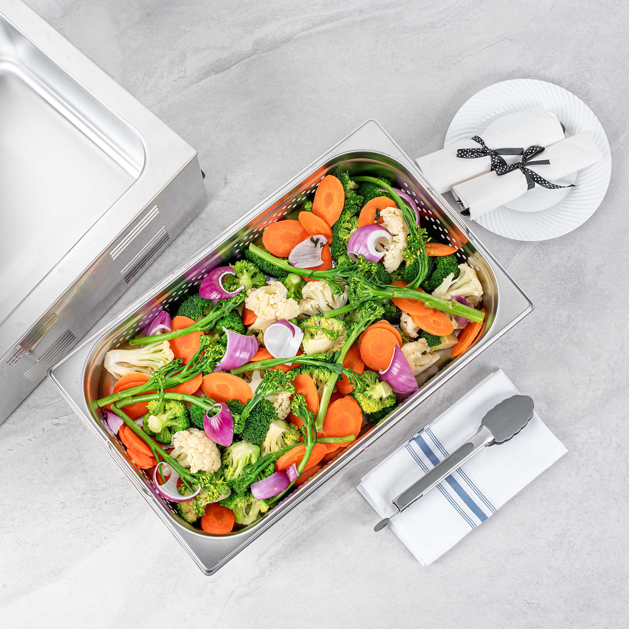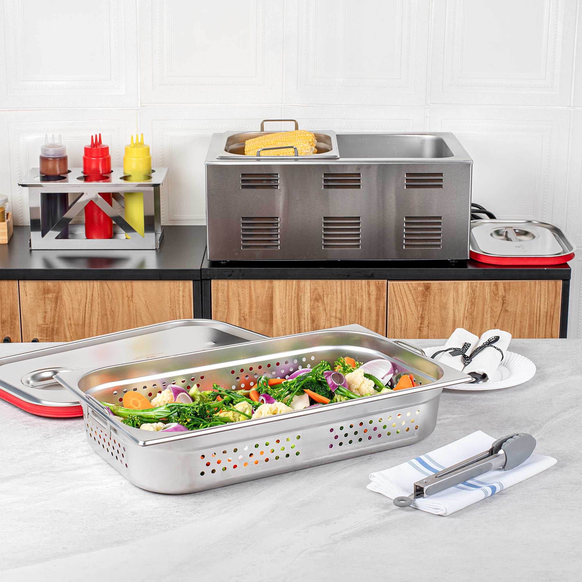 - Collapsible handles make it easy to carry and reload prepared foods in the steam table pans
